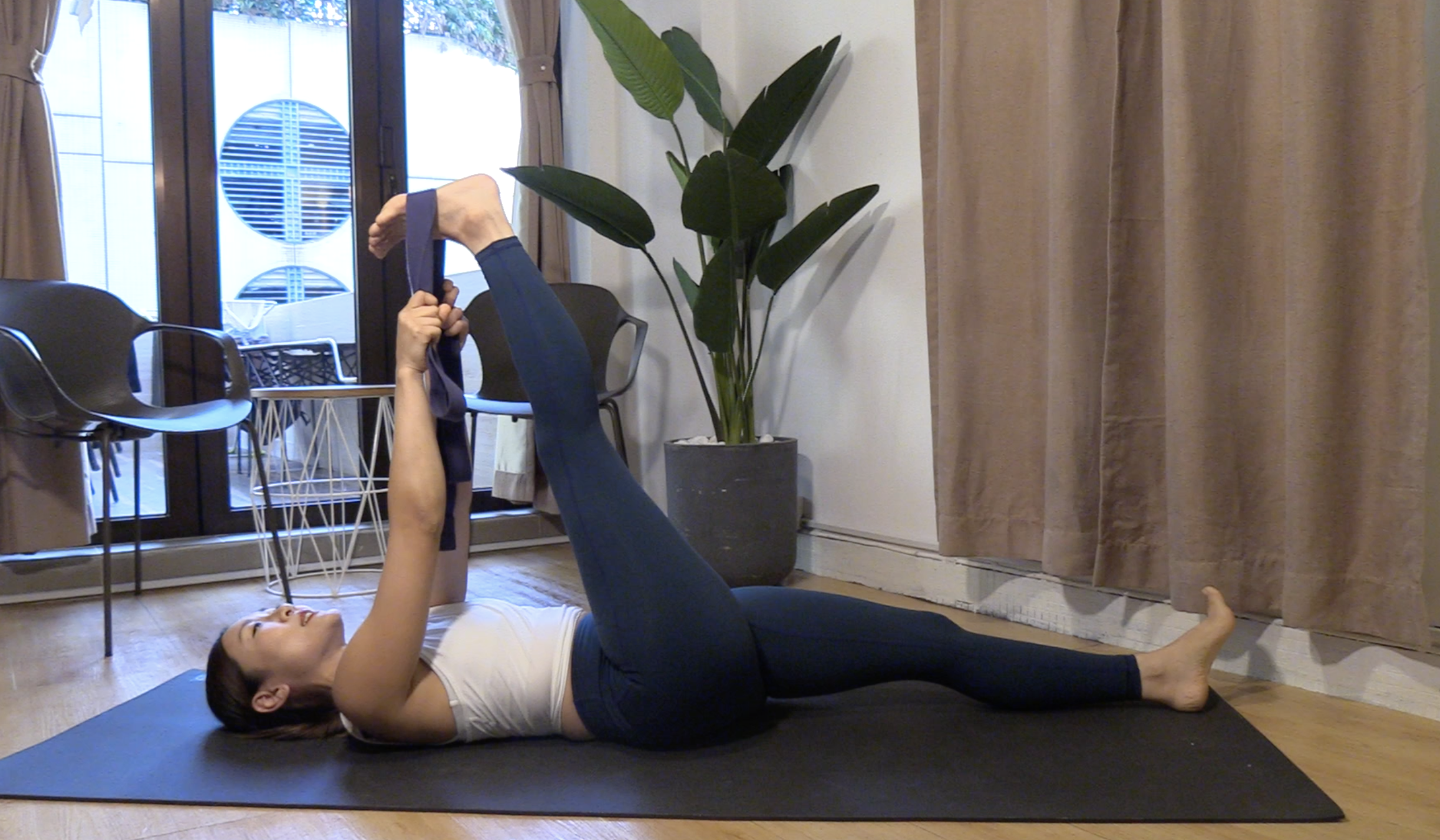 做法:呈躺姿狀,抱著右膝蓋,雙手握住彈力帶(可用毛巾取代),將彈力帶繞過右腳板。吸氣時,雙手輕拉彈力帶將右腿垂直抬高,與地板成90度,左大腿保持伸直,並且緊貼地面。若柔軟度足夠,可將右腿拉近胸部,停留8至10個呼吸後,慢慢放下右腿,換另一隻腳,重複3組。