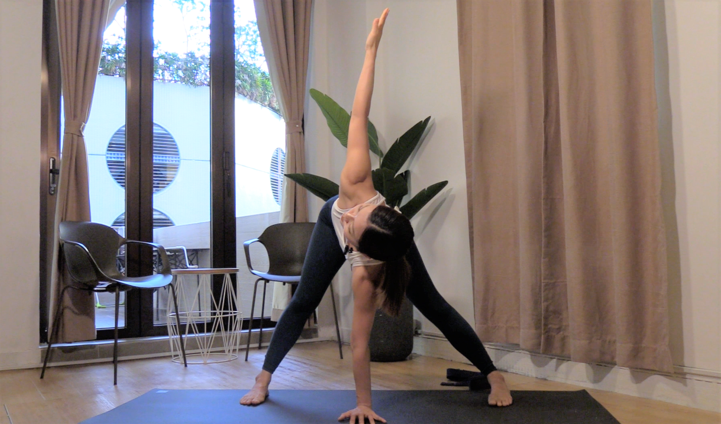 做法:雙腳保持四呎的距離,吸氣挺直脊椎,呼氣彎腰雙手撐地,左手撐地右手捉住腰部,然後扭腰,右手向上伸直,如果柔軟度不足右手可撐腰,保持5至8個呼吸,轉另一邊。