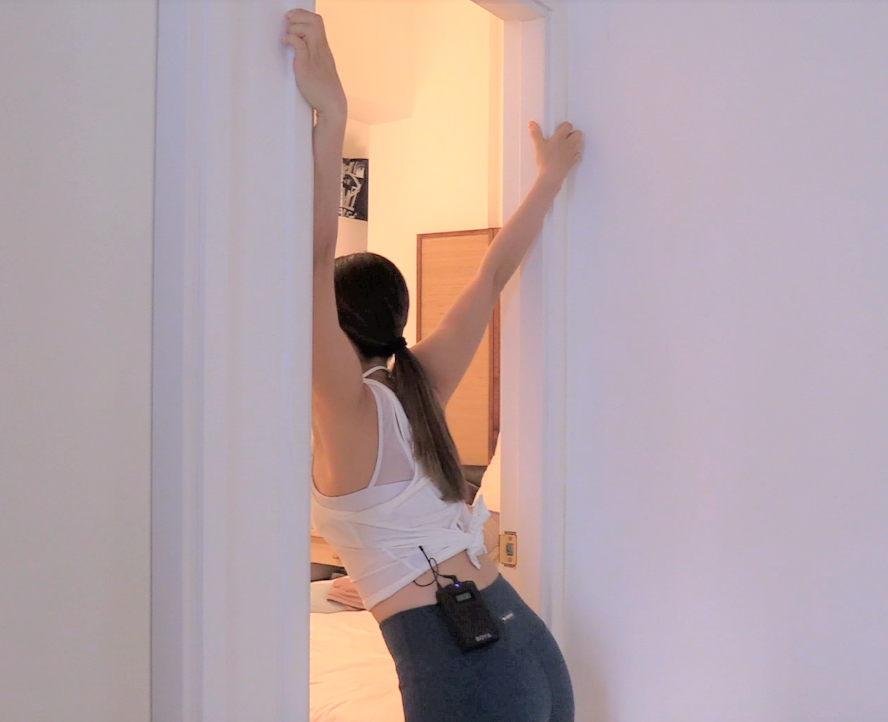 做法:雙手扶住門框,將雙腳打開至盆骨位闊度,把盆骨及腰部推前,腹部及臀部收緊,身體向前壓,大概8至10個呼吸後回到原來位置,可將手臂放至不同高度進行拉伸,如手臂呈現90度角或完全伸直呈V字形。