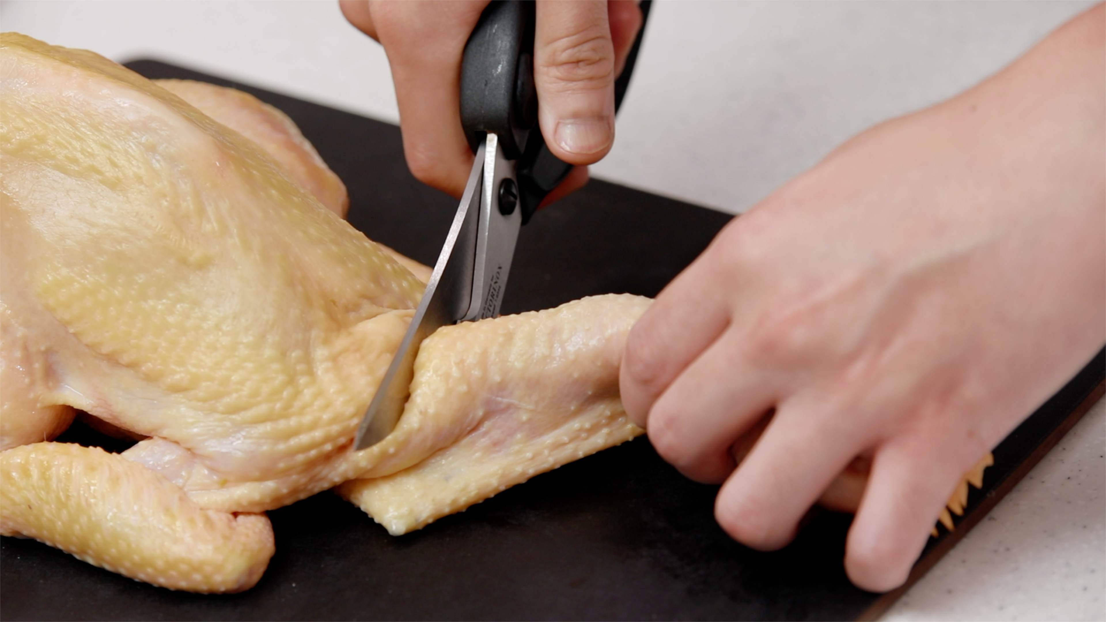 1. 洗淨雞的內外並抹乾,斬掉雞腳、雞翼尖、雞頭、雞頸以及三角骨。