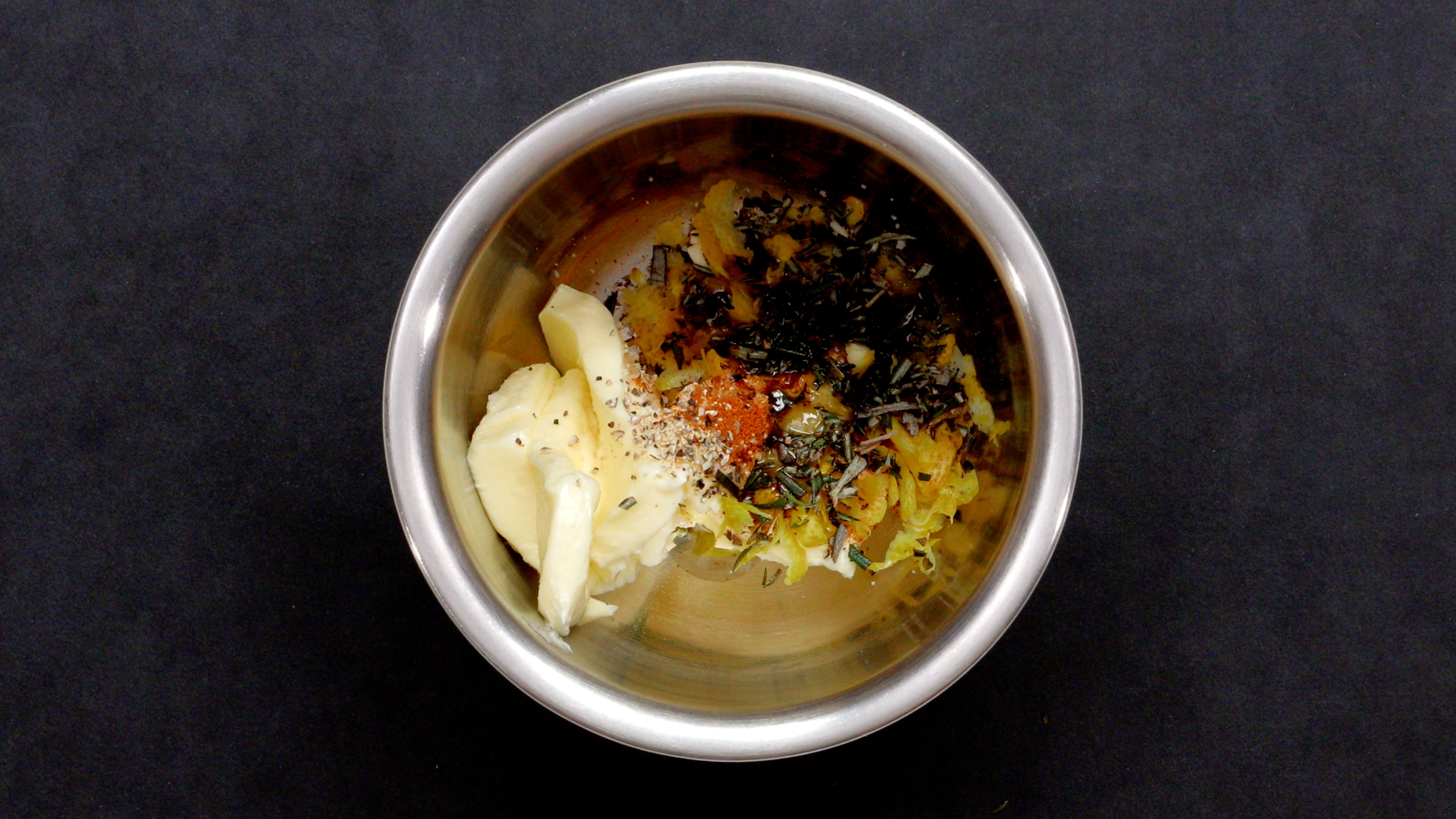2. 迷迭香和蒜頭切碎,刨檸檬皮,混合一半迷迭香碎及牛油、鹽、紅辣椒粉、檸檬皮、橄欖油。