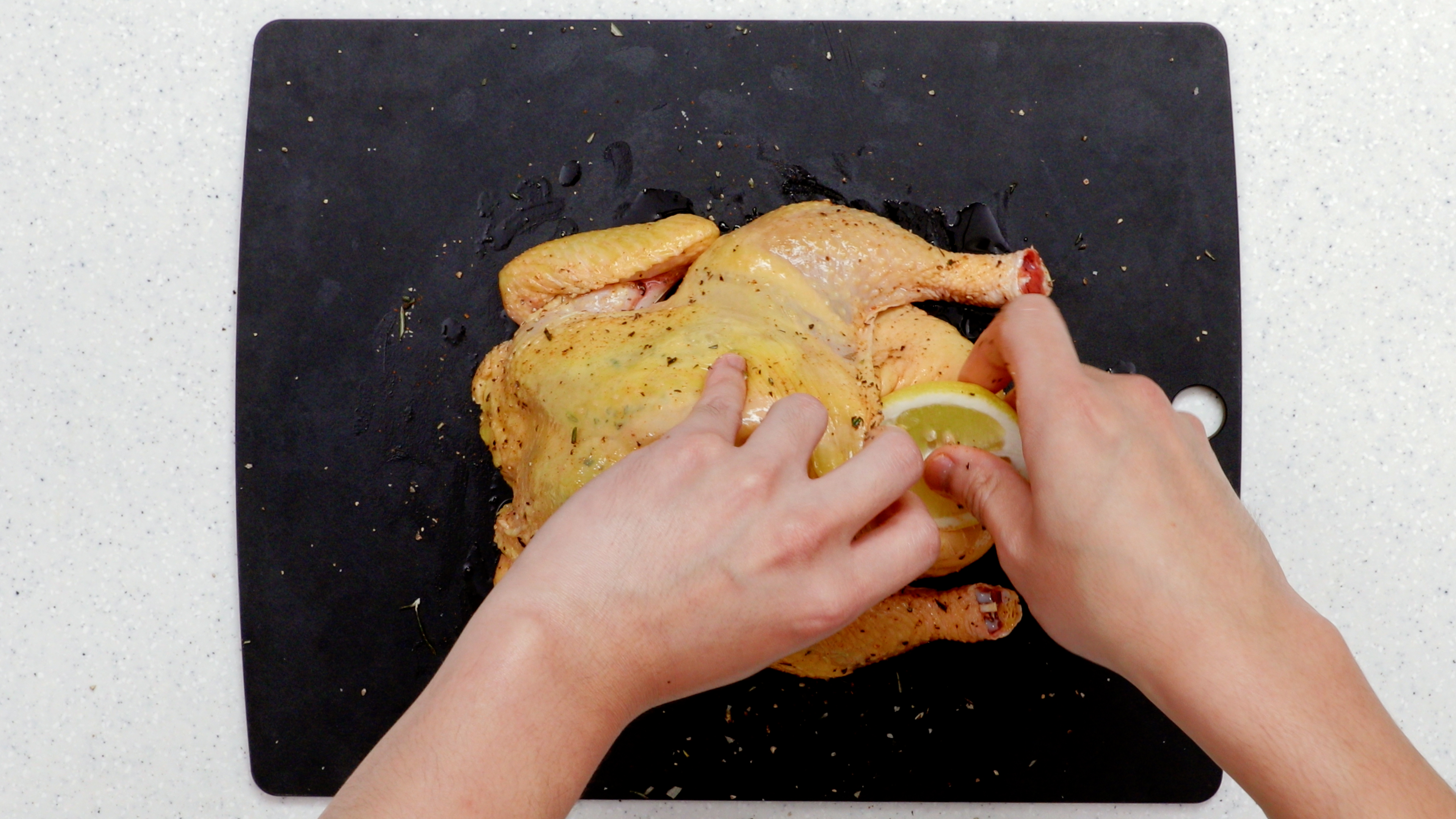 4. 檸檬切半放進雞腔內。用煮食用棉繩將雞綁起來,再塗上適量橄欖油、鹽、胡椒粉,剩下的一半迷迭香碎均勻塗在雞外面。