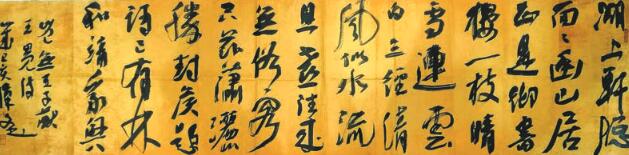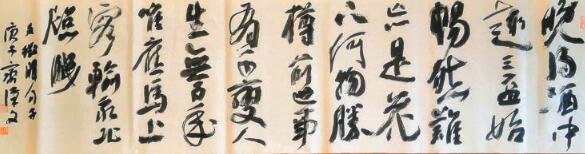 其行草勢張氣暢,似吞雲吐霧觀瀑聽泉。如對聯《詩書千秋經綸志,松開四時瀟灑心》、橫幅《三國演義開篇詞》、條屏《歐陽修醉翁亭記選句》等,得王鐸筆意,落筆漲墨四溢,塞堰漫湖;行筆水流旱灘,時緩時急;快時暴風驟雨,慢如蠶蛛吐絲;勢張氣滿,節律明快,意遠韻舒。 ( 劉同偉 魏坤)