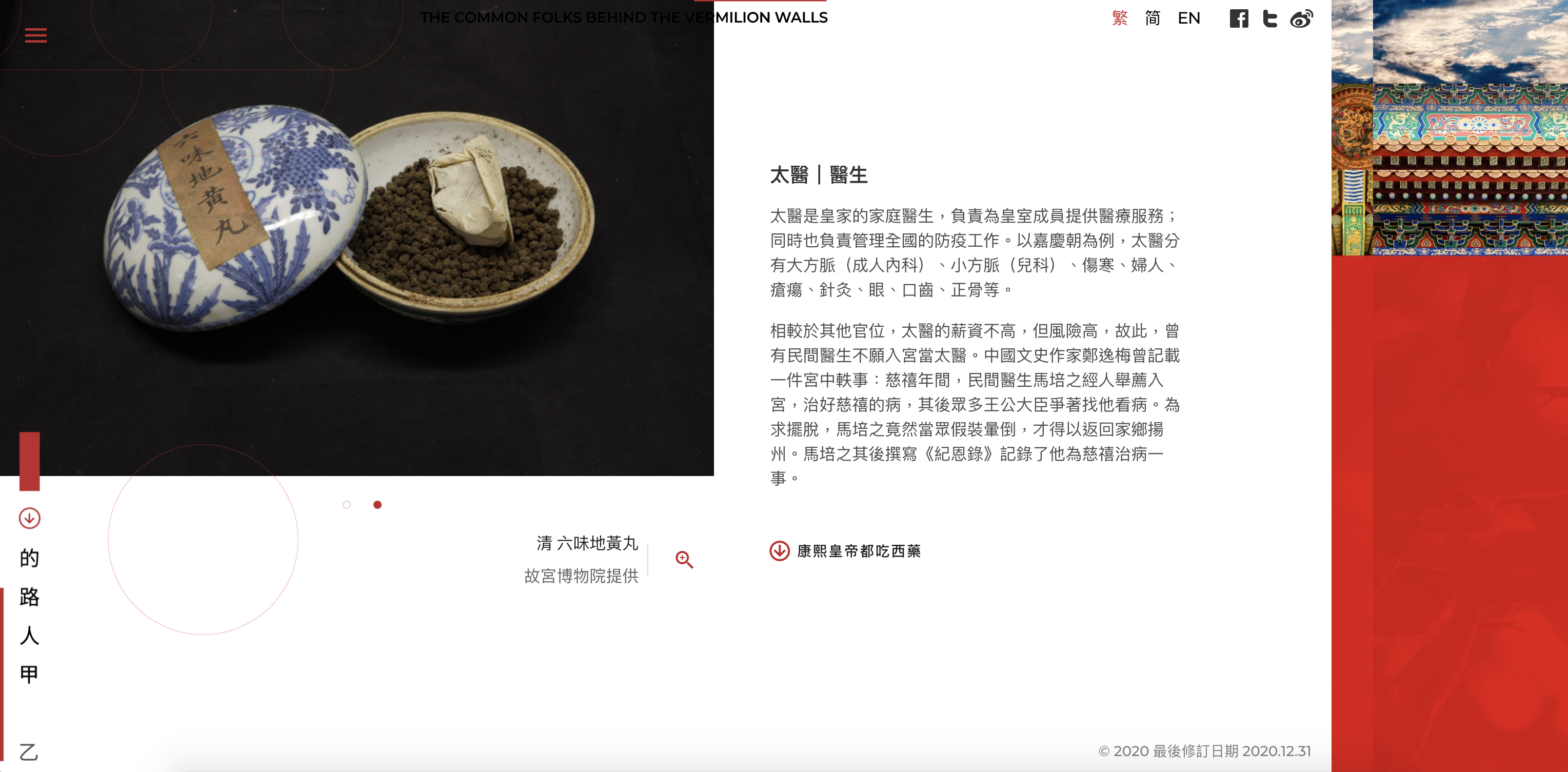 有着六百年歷史的紫禁城,相信讀者對於城內皇家的盛世繁華,爭奇鬥豔的故事都相當熟悉,然而,紅牆下名不見經傳的小人物,如何發揮他們獨當一面的技術和智慧,同時又過着什麼生活?康文署與故宮博物院合辦「穿越紫禁城」系列,繼2019年舉辦展覽「穿越紫禁城-建築營造」後,最近再合辦線上展覽「紅牆下的路人甲乙丙」,以文字、影片及圖片介紹宮中小人物,如五星級的禦廚、妙手回春的太醫、手藝精湛的匠人等人物,通過揭示他們的職責及技藝,從平凡人角度了解宮中生活。