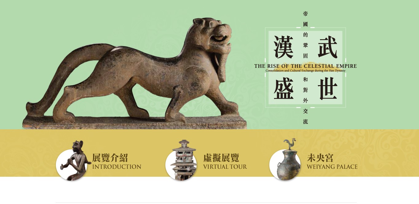 於中國歷史上,漢朝是國祚最長的大一統王朝,在政治、宗教、藝術和學術等各方面,均對後世有深遠的影響。香港歷史博物館籌辦「漢武盛世:帝國的鞏固和對外交流」展覽,分別從北京、廣東、廣西、雲南、甘肅等十多個省挑選逾一百六十組文物,以漢帝國的崛起作為中心,分為「漢帝國的鞏固和擴張」、「漢代社會生活」和「漢代的科技、文化與中西交通」三個部分。在線上的虛擬實境展覽中,透過文物認識漢代的政治、藝術、社會風貌和文化發展等,當中更會介紹包括香港在內的嶺南地區在漢帝國中的地位及發展過程。 (撰文:Janice 圖:網站截圖)