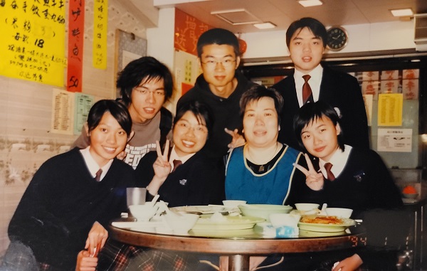 梁僑宴(前右二)深受街坊愛戴,圖為1994年一班經常光顧「兩合」的中學生在畢業當日專誠到店內與她合照。