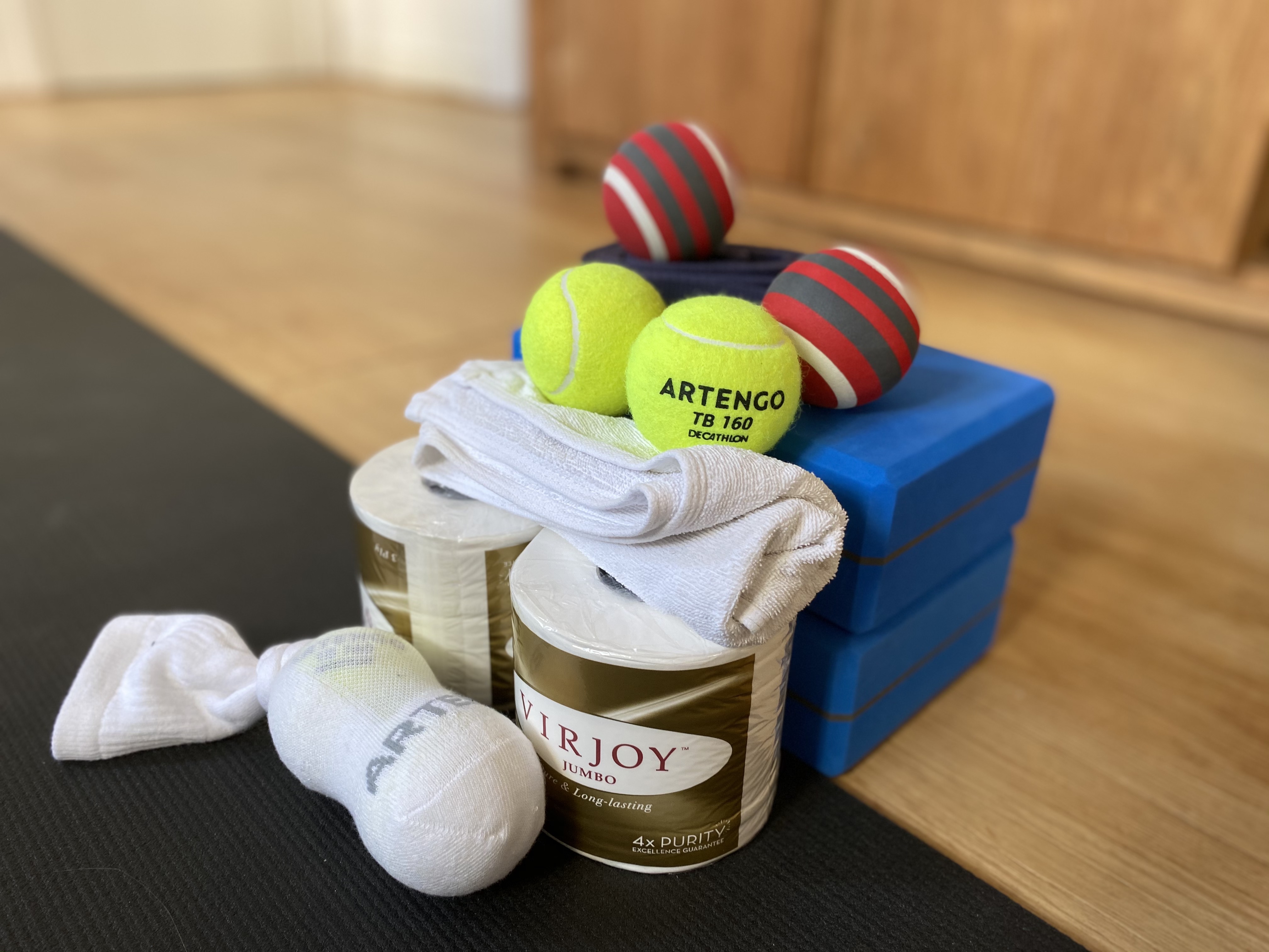 瑜伽藉由各種體位法,增強肌力與柔軟度,配合長而慢的呼吸,放鬆身心、提升專注力,兼具按摩身體之功效。做瑜伽除了要使用瑜伽墊,還可以使用器材輔助,然而一般人家中並沒有相關器材,瑜伽導師Jyothi建議運用家居常見的物件代替瑜伽器材,如網球代替按摩球、廁紙卷代替瑜伽磚、毛巾代替瑜伽繩,配合瑜伽動作,幫助按壓及伸展肩、頸、膊頭、腿部的肌肉,放鬆身心。