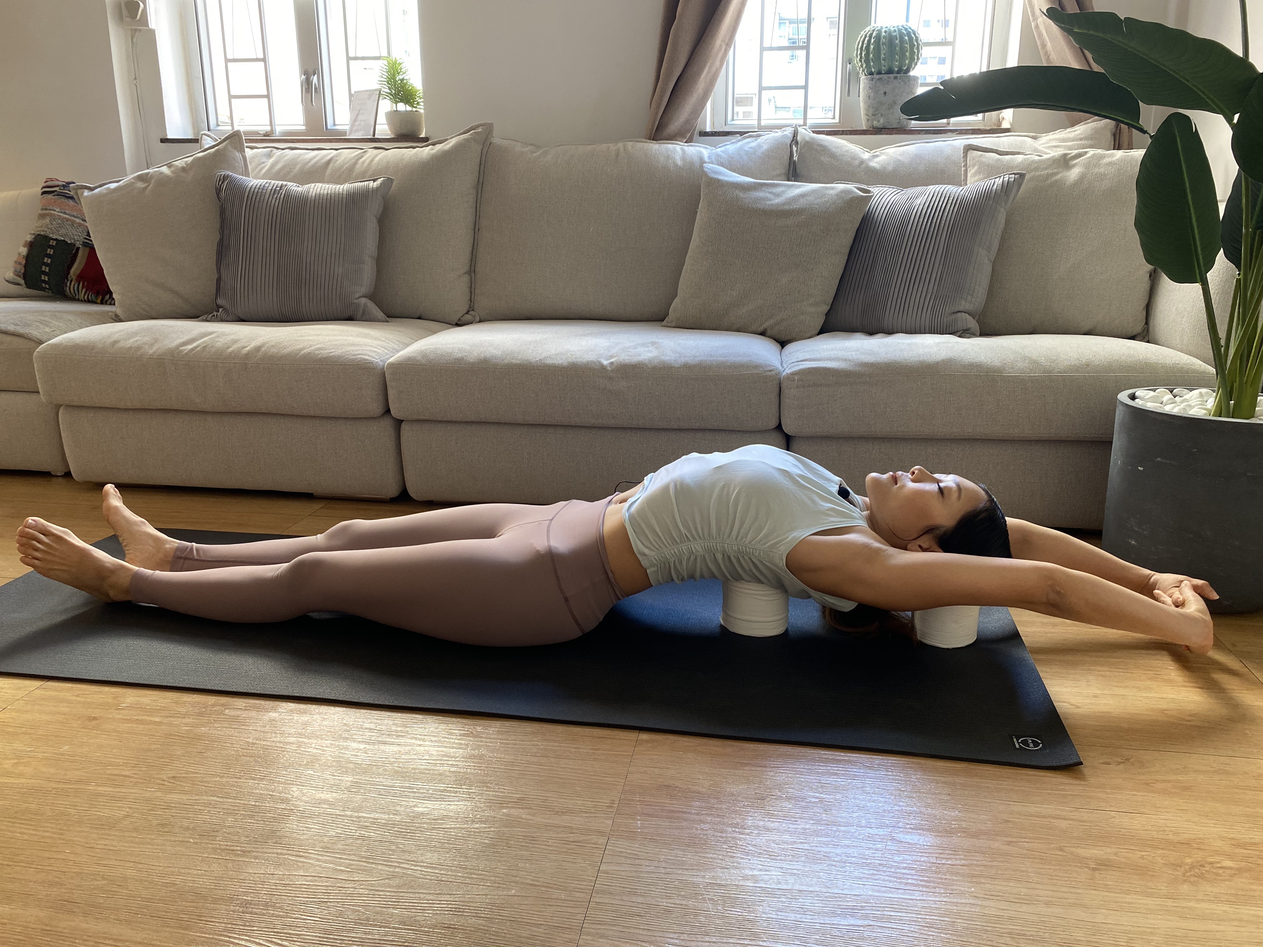 做法:首先把一個廁紙卷放在肩胛骨的中間位置,躺在瑜伽墊上,第二個廁紙卷放在頭下,放鬆膊頭,雙手向後伸展,放鬆2至3分鐘,保持長而慢的呼吸。之後雙手十指緊扣,進行伸懶腰伸展全身,可多伸展幾次。完成後雙手捉著瑜伽墊的兩旁,透過手肘力撐起心口,慢慢地將廁紙卷移開,再躺下保持三個呼吸,讓身體放鬆。