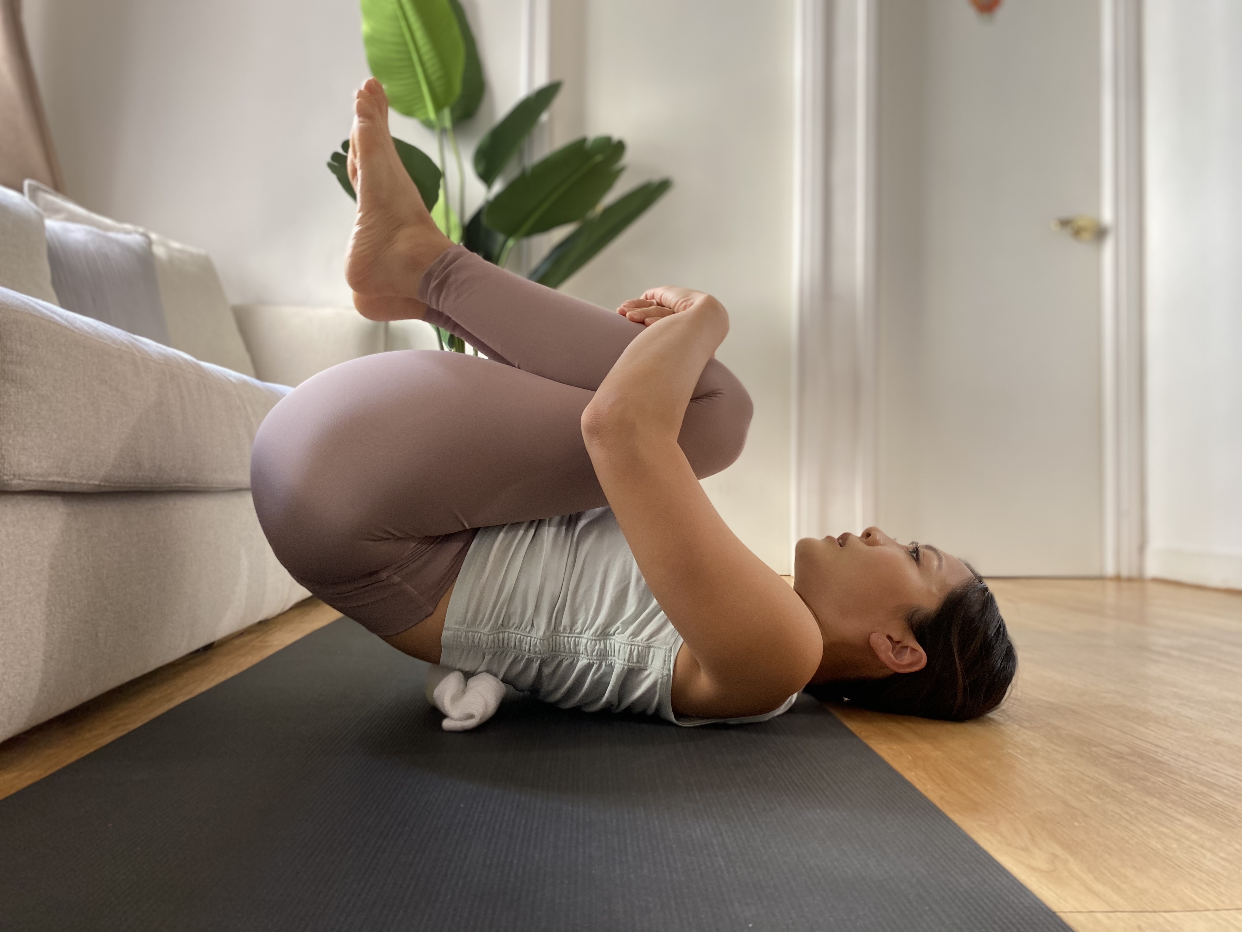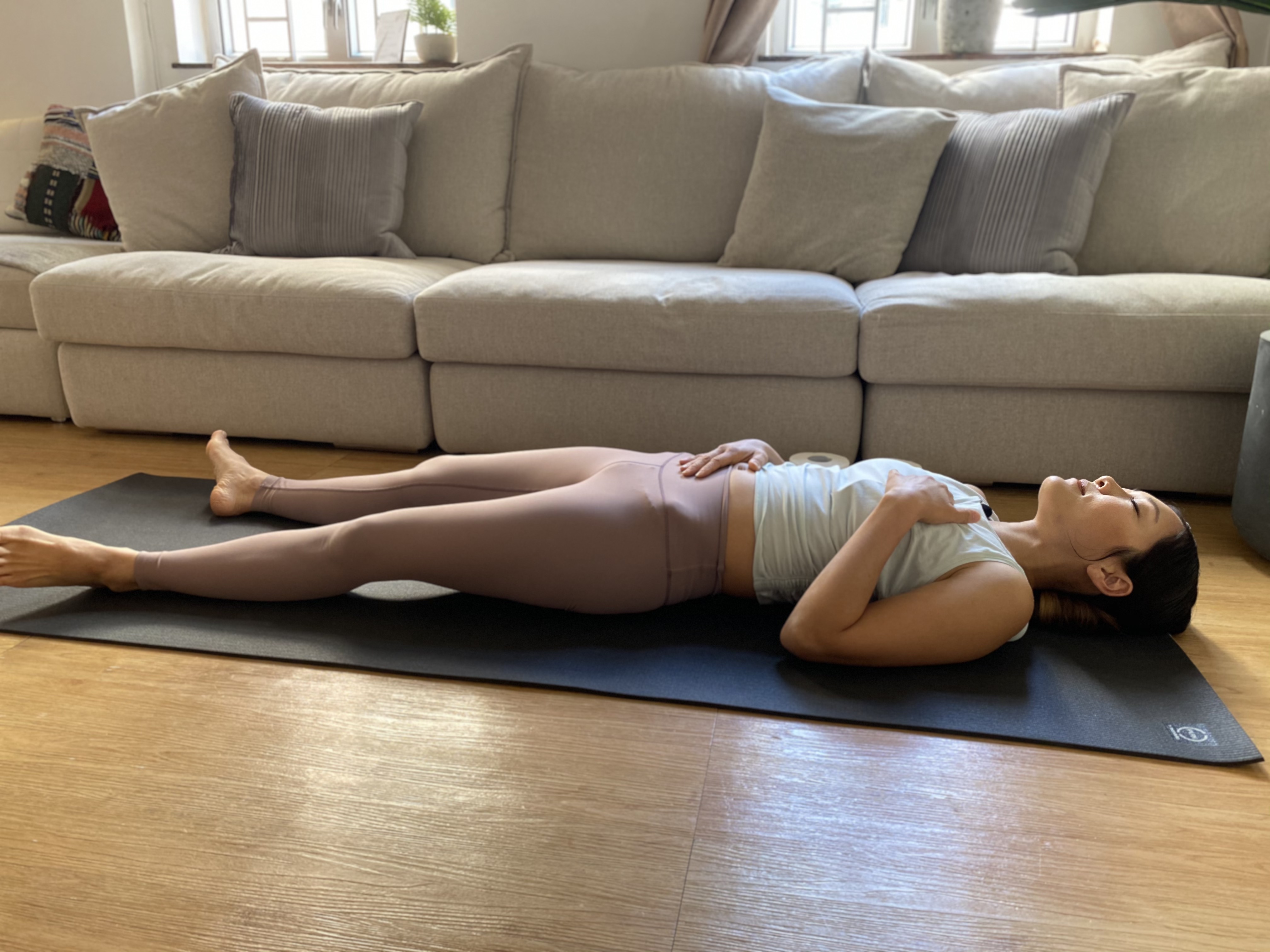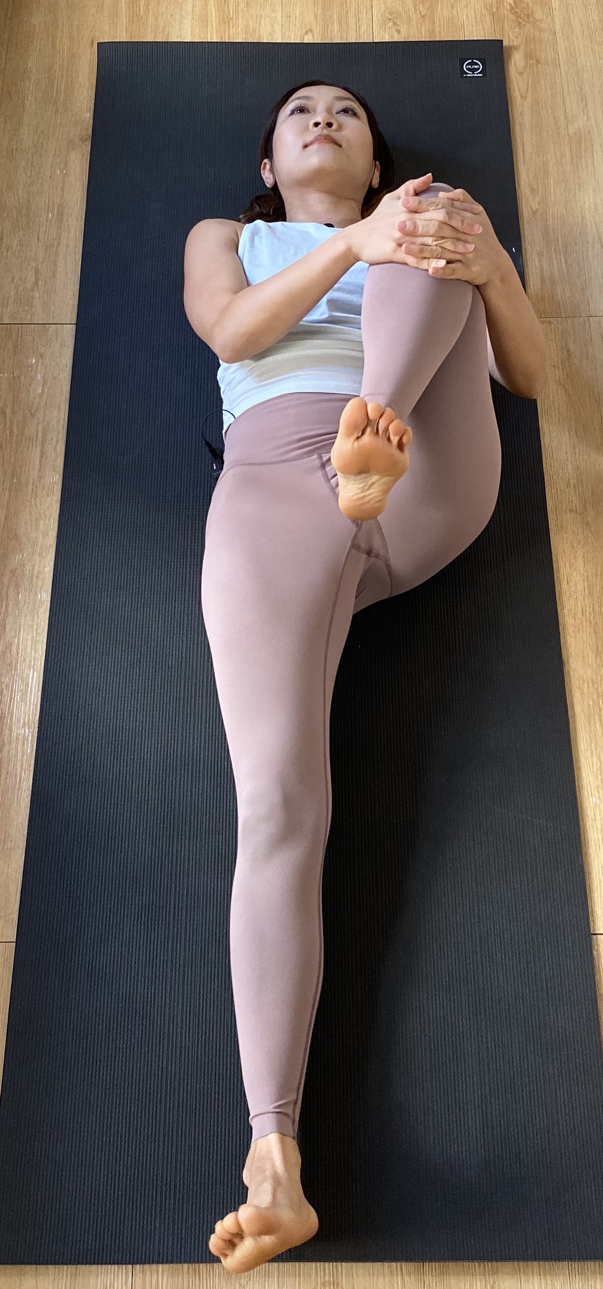 做法:躺下,抱住左腳,然後將毛巾繞過腳底,吸氣伸直雙腳,用力撐直左腳,形成90度角,緊記不要曲膝,保持大腿伸直,維持8至10個呼吸,如果柔軟度足夠可以把腳拉向胸口,然後把廁紙卷放在臀部左邊,托著大腿骨,再將左腳拉向左邊,拉伸大腿內側,保持8至10個呼吸,回到原本位置,取下毛巾,然後放下膝蓋將身體扭向右邊,視線望向左方,大概5至6個呼吸後回到原本位置,換另一邊。