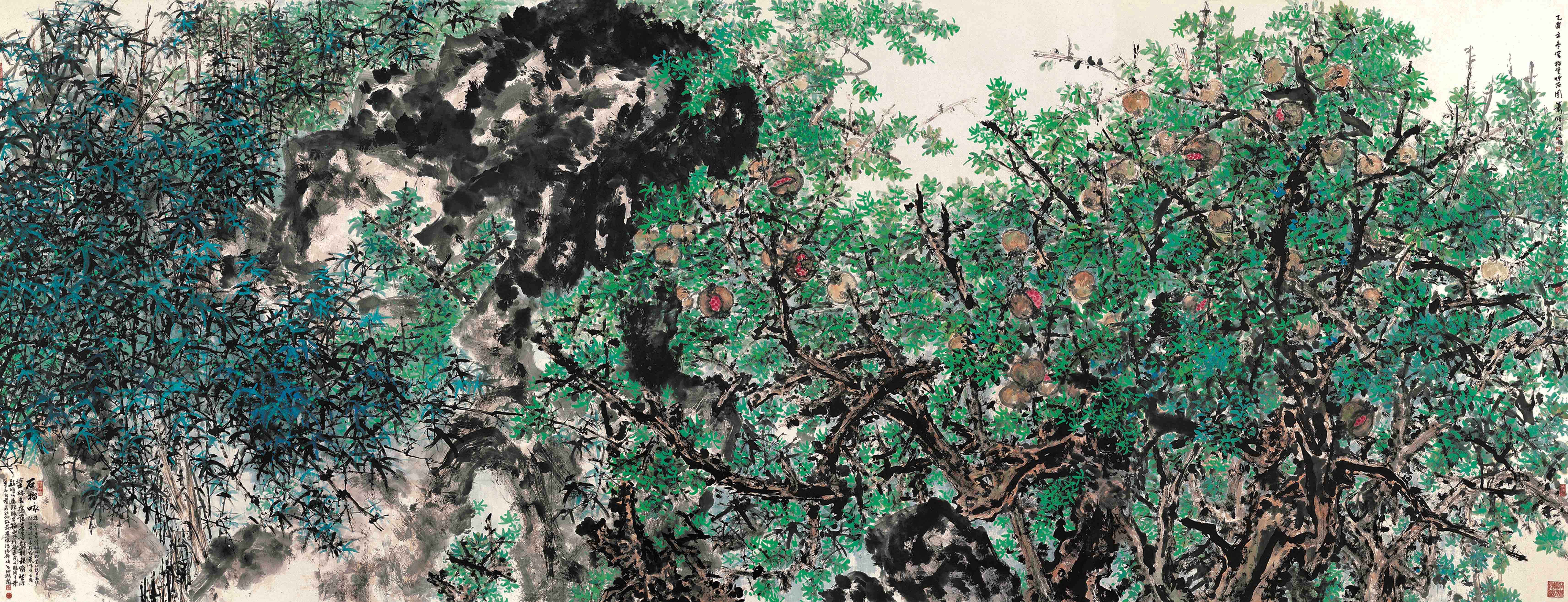 蕭暉榮此巨製《石榴詠》畫面中一塊碩大的壽石從左下角斜向畫上方頂天立地而生,穩住了整個畫面,右邊畫面底部隱約可見奇石叢立,石間一棵老石榴樹茂盛生成,主幹環轉迂迴,勢如蛟龍,剛韌朗硬,蒼勁有力;枝繁葉茂,碩果纍纍,意氣蓬勃風發,喜氣洋洋。左邊畫面生機勃勃的修竹圍繞壽石自然叢生,竹葉茂密成蔭,有點、有飛、有挑、有卷,左右顧盼,上下相生,八面玲瓏,向背俯仰交錯,濃淡相映成趣,令人倍感其豐神綽約、奕奕有致。