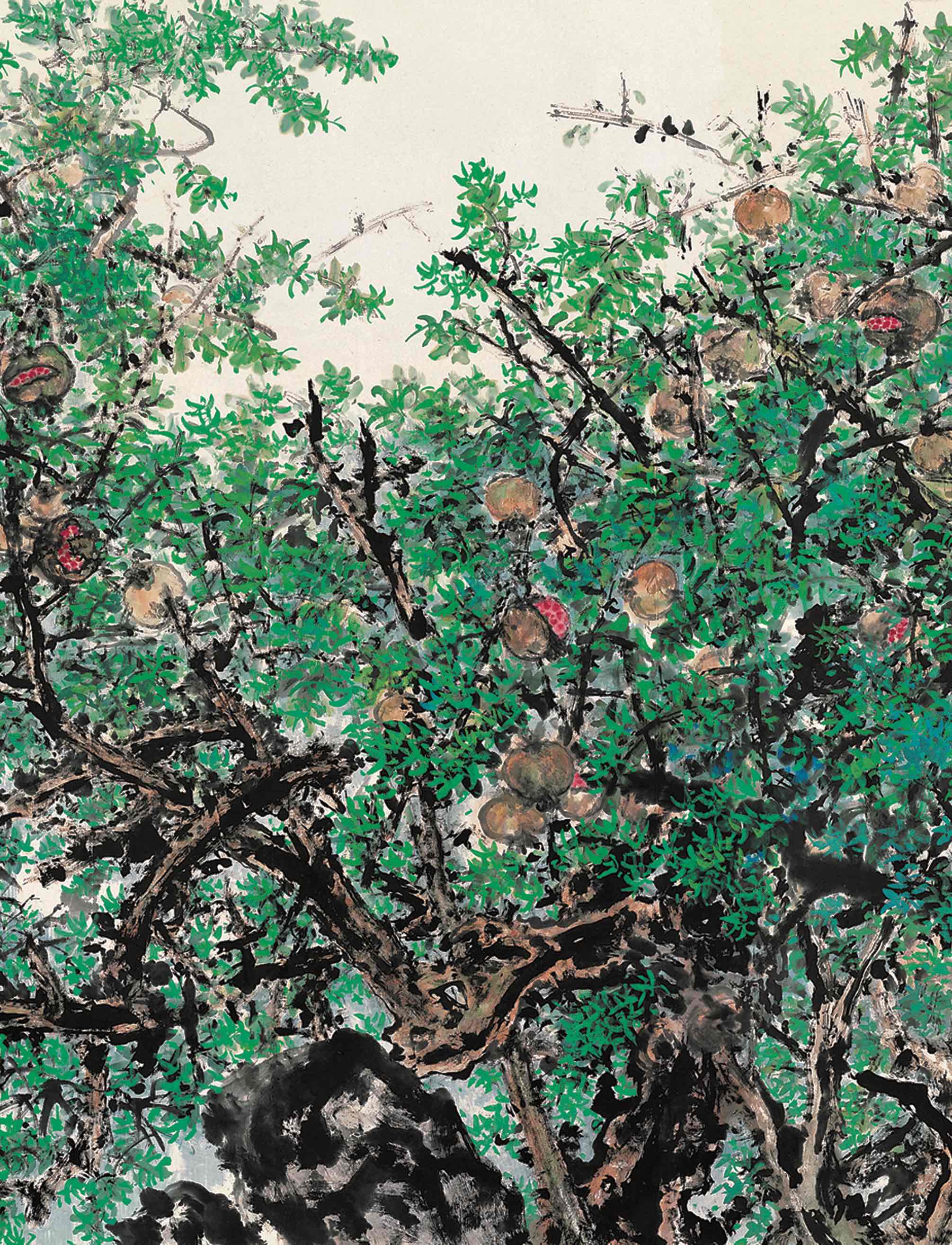 作為實踐書畫同源的佼佼者,蕭暉榮在創作時成竹在胸,將書法的抽象美和章法布局引入其中,形神俱備,遊刃有餘。當遣墨用筆時,他並不拘泥於採用任何一種筆法,而是將各種書體技法融合貫通,隨意應用,得心應手,渾然天成。石榴老幹用筆剛勁老辣,力透紙背,筆墨幹濕有致,虛實相生。石榴葉子和竹葉的描繪更是恣意奔放,各種調子的綠色和藍色,以及濃濃淡淡的墨色層層點染,厚重而靈動,富有立體感,新穎跳脫,別具匠心。繁密的筆觸充滿生命力,也形成了強烈的視覺衝擊力。凡此種種,均可見出蕭暉榮教授於傳統中國畫創作上駕輕就熟之餘又有著獨特的創造,特別是他對於「疏可走馬、密不透風」理論的發展和實踐,更令人拍案叫絕。 (文:蕭芬琪)