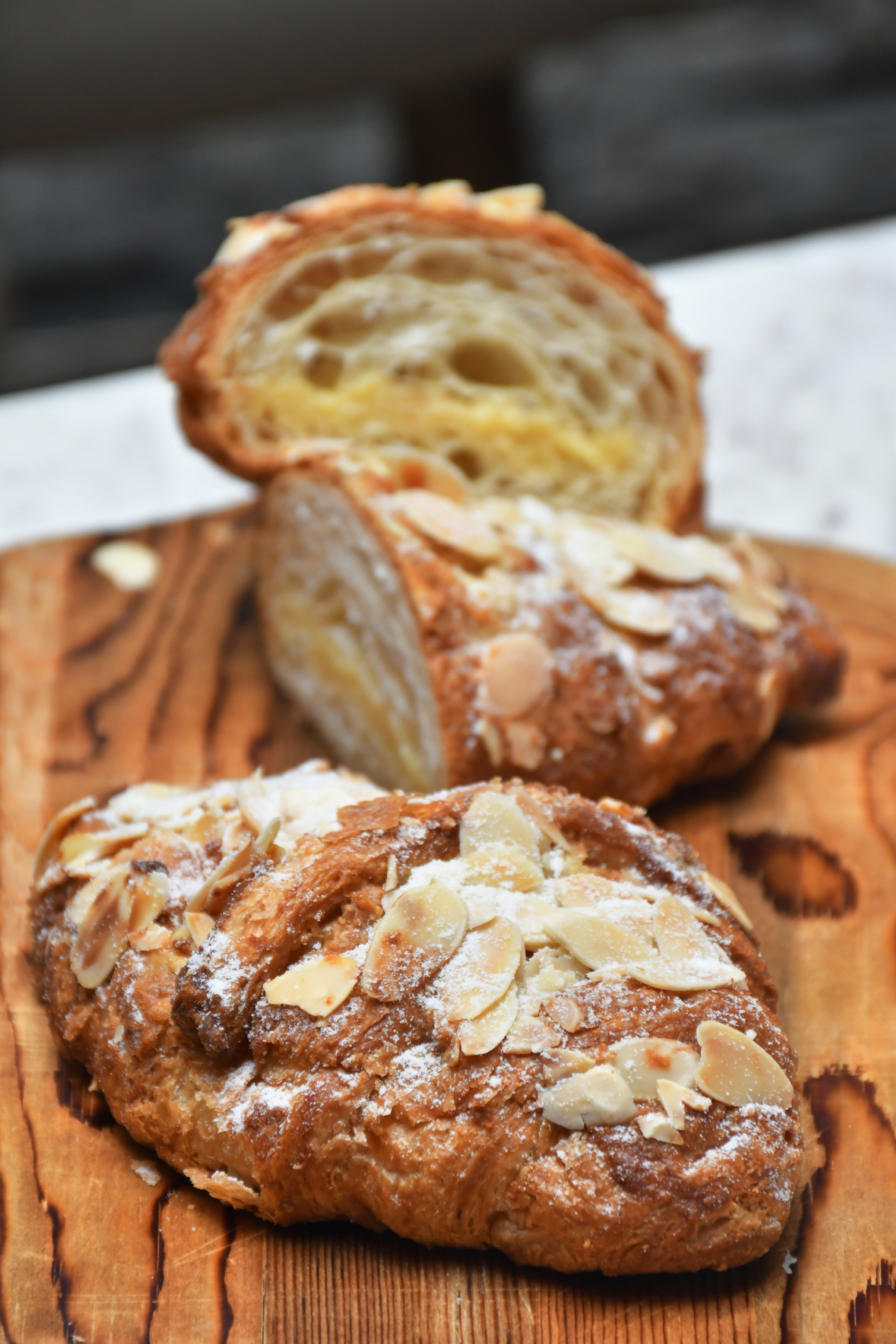 杏仁牛角酥(Double Almond Croissant)與奶油酥不同,外脆內軟,橫切兩半時呈現蜂窩形狀。
