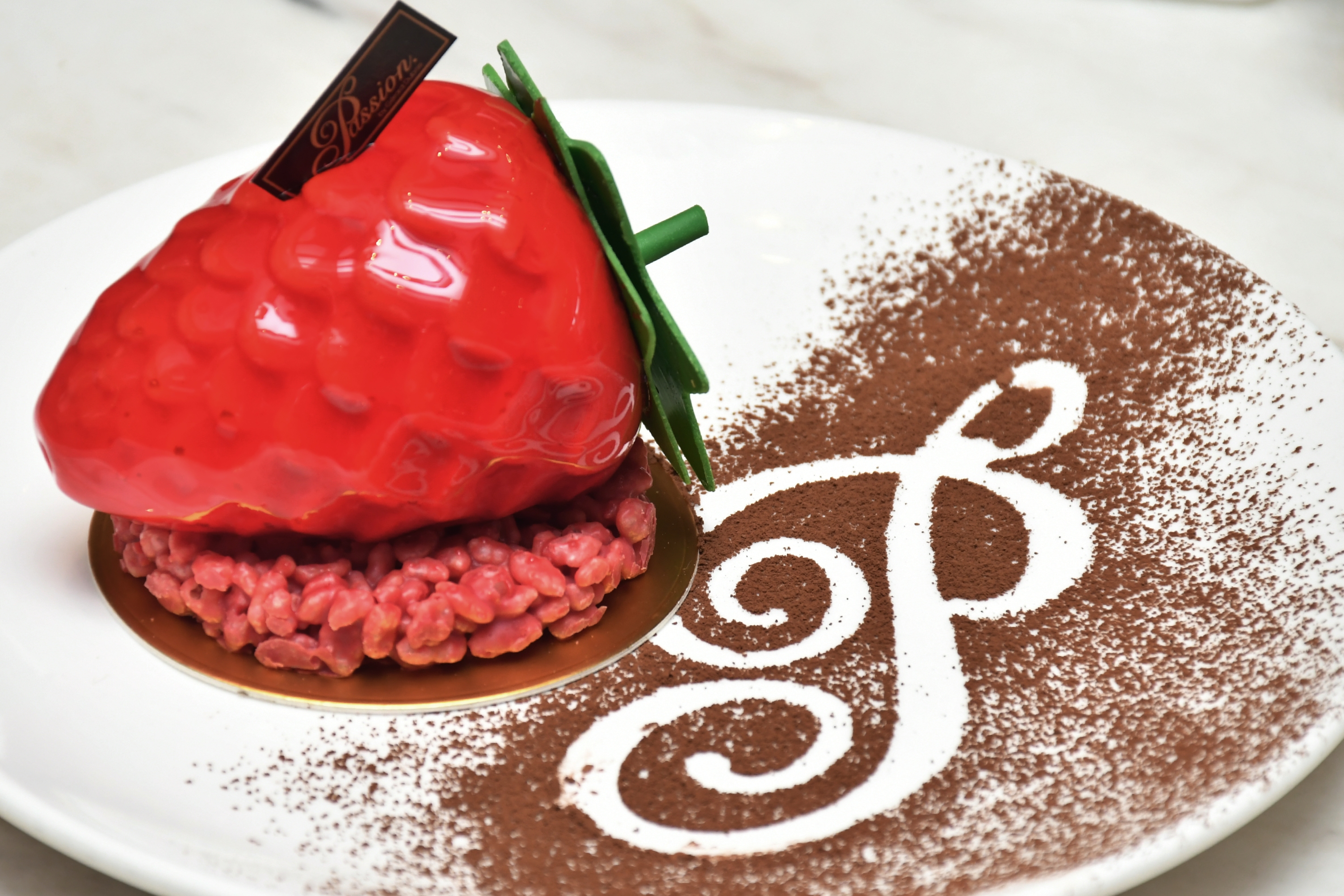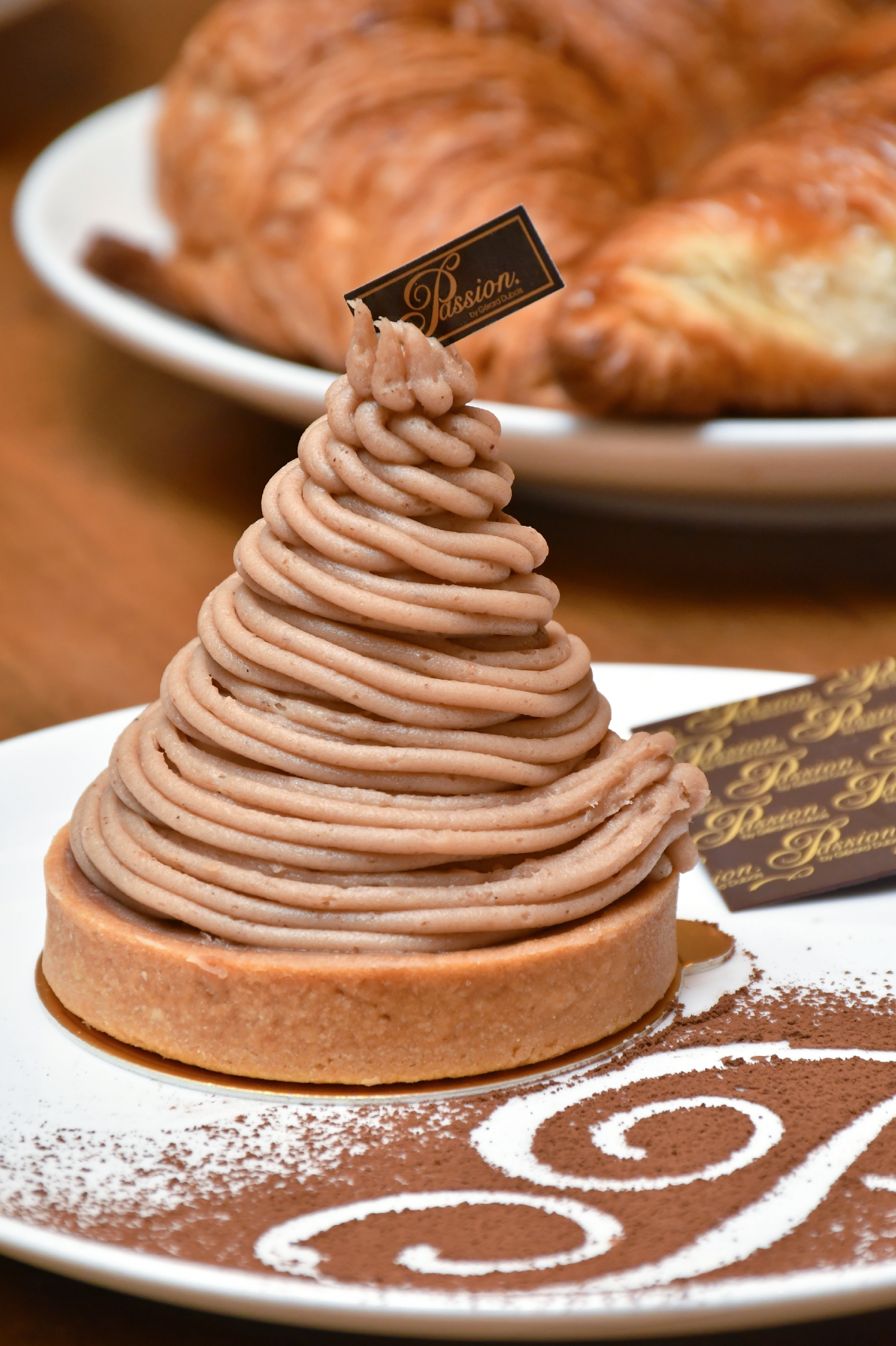 法國甜點大師Cèdric Grolet曾掀起全球水果形狀甜品風潮,用水果原料去製作與真實水果相似度很高的甜點,顏色、樣子和質感都非常逼真,Passion也推出法式士多啤梨蛋糕(La Fraise),Yvonne表示:「La Fraise選用Valrhona Inspiration士多啤梨朱古力,這款朱古力由新鮮法國士多啤梨製成,成分天然。中間夾著厚滑的士多啤梨朱古力摩絲,中心是以士多啤梨蓉及大黃 (Rhubarb) 製成的果凍,並配以一層薄薄的綠色開心果蛋糕。」把摩絲、果凍及底層的士多啤梨朱古力脆米夾著一起吃,味道酸甜又有層次。另一款擁有尖塔外形的熱情果栗子撻(Passion Fruit Mont Blanc),形狀參考勃朗峰(Mont Blanc)山頭而成,外層使用栗子泥製成,Yvonne表示:「師傅在內餡及撻底加入熱情果,以清新的果酸平衡整體的甜味。」