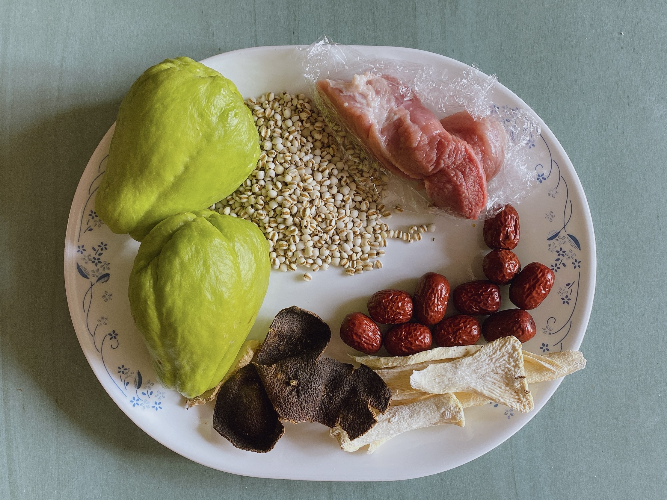 材料:佛手瓜2個、淮山30克、生薏米20克、瘦肉100克、紅棗10枚去核、陳皮1小塊、生薑2片。