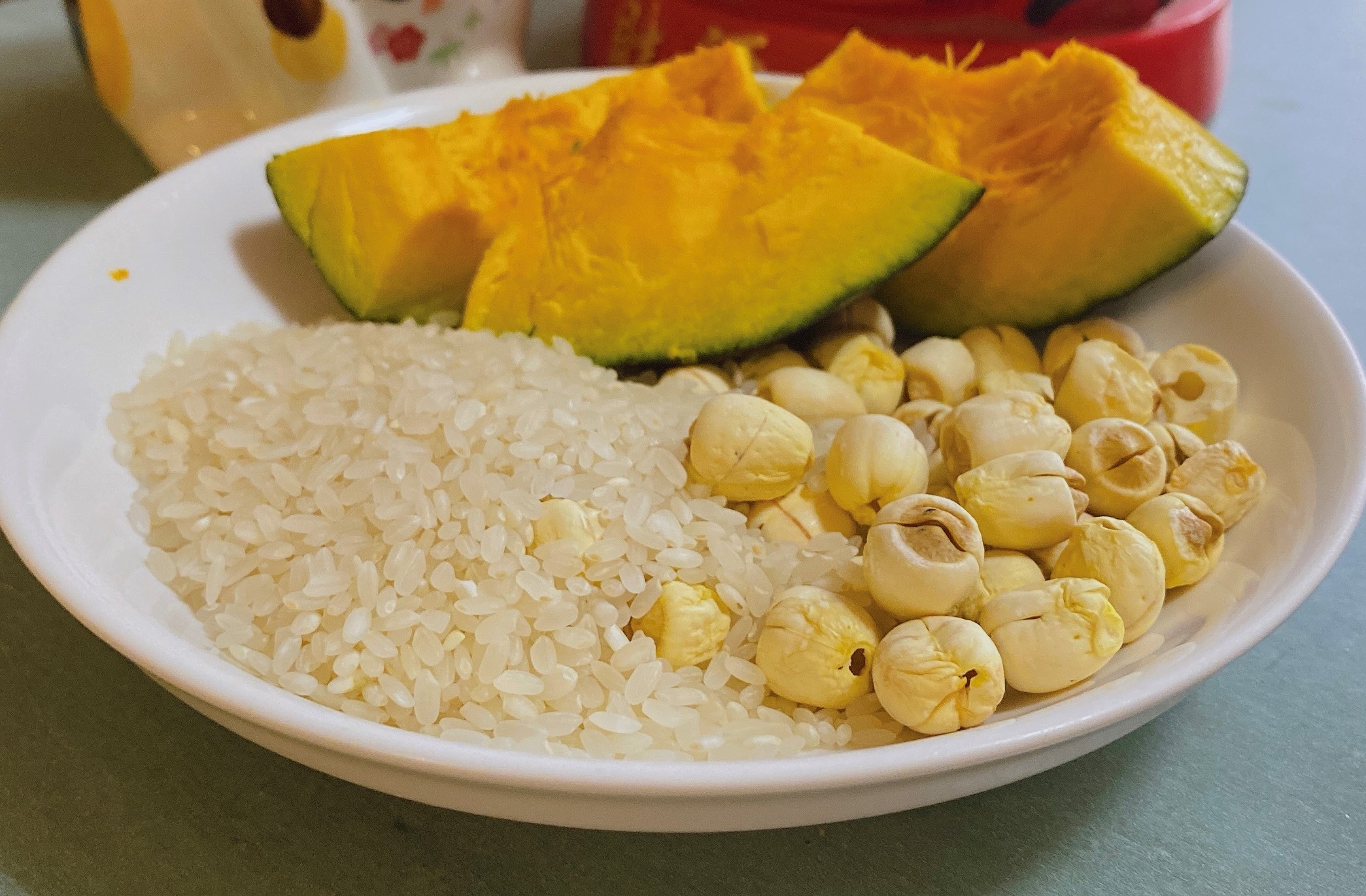 材料: 新鮮南瓜數塊、大米50克、蓮子30克。