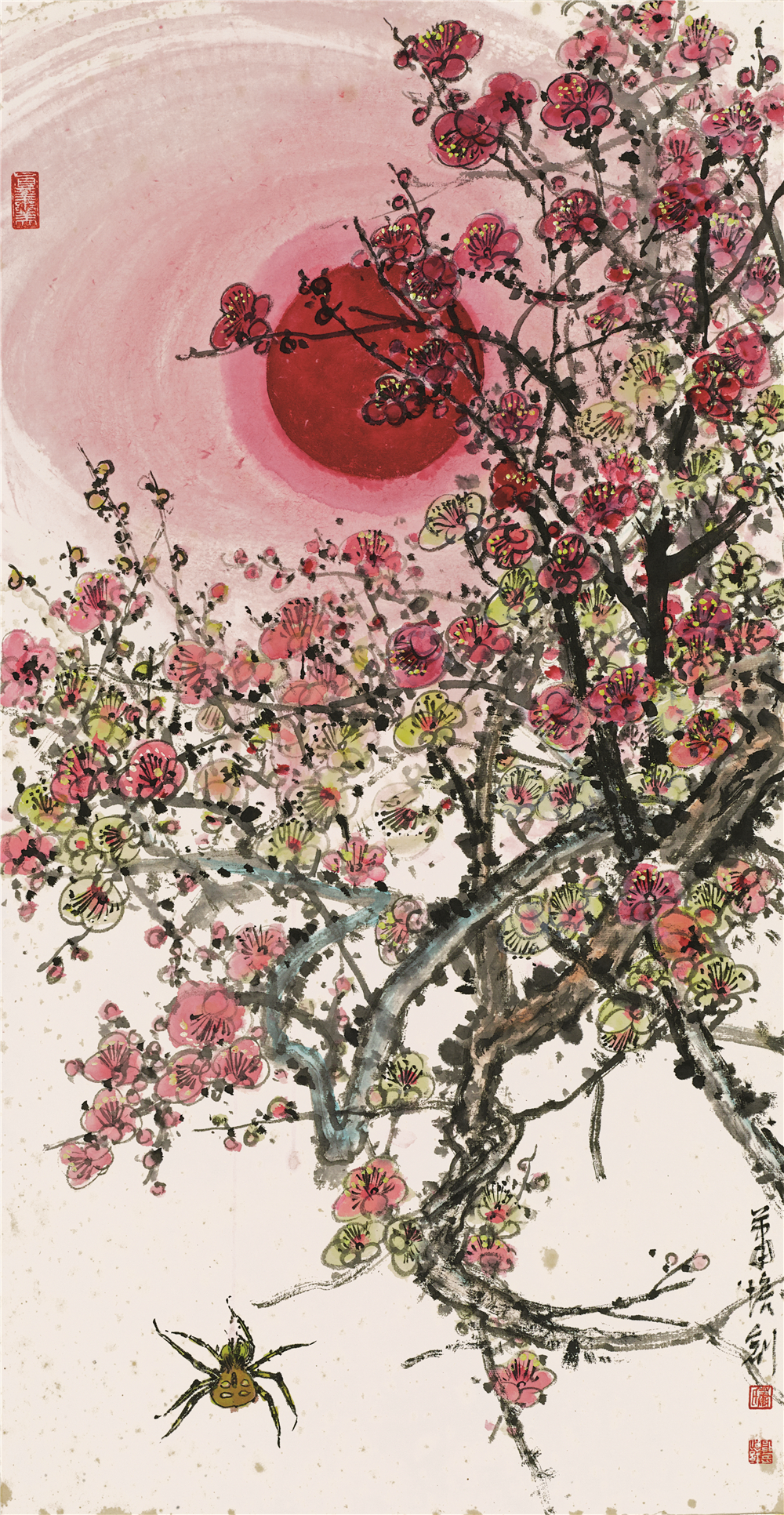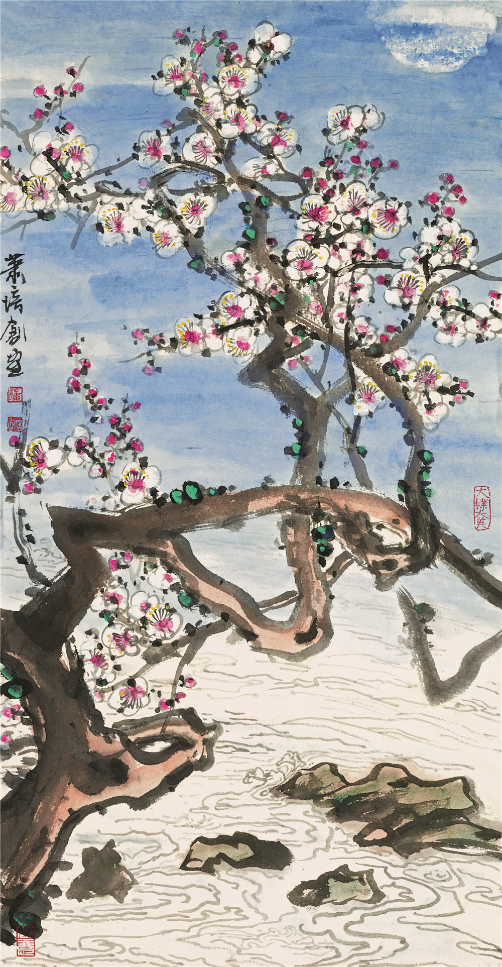 作為策展人,在策劃文化藝術交流活動和致力推介書畫家的過程中,在與海內外眾多藝術家交遊中,蕭培創獲得許多學習的機會,他對傳統中國畫精髓樂此不疲地研習,兼收並蓄,不斷練習反芻,漸成一格。他的梅花作品,在硬朗的筆墨中透露著一種堅韌不拔、百折不撓、凌寒獨立的鐵骨錚錚氣度。同時,他又在作品中注入了生活氣息,在背景處理上,他除了喜歡以山水或石頭作為襯映,有時也會以方格圖形烘托,可視為窗框或窗簾,或只是線條的組合,令畫面更富層次感,也平添現代感。而花盆、銅錢、昆蟲等的添加和特別處理,很好地增加了生活的趣味,使畫面流淌著一種清新時尚的朝氣,意趣盎然。 (文:蕭芬琪)