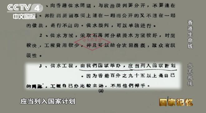 圖:周恩來總理批示,「供水工程,由我們國家舉辦,應當列入國家計劃。因為香港百分之九十五以上是自己的同胞。」現存于中央檔案館