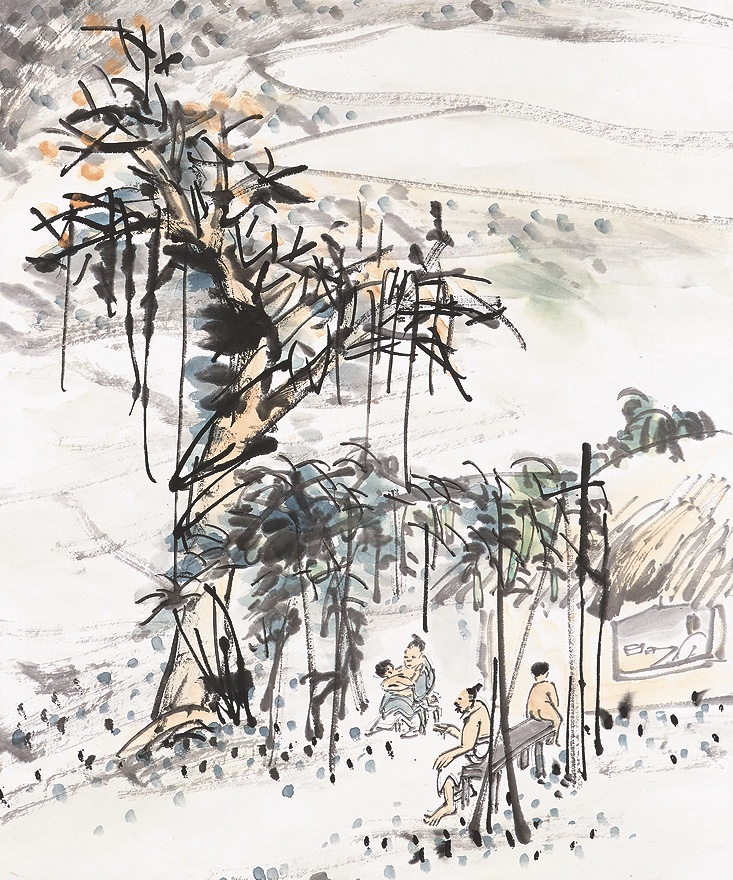 王一亭作為海上畫派代表人物之一,擅寫花果、鳥獸、山水、人物、佛像,技法純熟,揮灑自如,大幅小幀,或天真爛漫,或雄健渾厚,自成一家,《薄暮納涼》為其晚年佳作,頗顯珍貴。畫中表現了夏日傍晚時分,一戶普通人家在門前瓜棚下納涼,近賞池邊蓮香,遠觀平崗山色的景象。畫中近處野塘邊老樹斜立,池中蓮花綻放,遠送清香;稍遠處可見茅屋中有一長者,屋前坐著一對夫婦與兩個孩童,正於瓜棚下乘涼;更遠處洲渚參差,與遠山相接,山不甚高,卻頗奇崛,山側鄰水益顯幽雅。此畫筆墨蒼勁,看似粗服亂頭,不事修飾,實則遺貌取神,氣韻自然生動。畫中物象如近處的蓮花、稍遠處的人物、遠處的山峰等,均略略數筆便交代清楚,顯得非常生動形象。尤其是畫中幾個人物,雖只略作勾勒,卻栩栩如生,其中兩個孩童也各不相同,其一還需大人抱,另一孩童則單獨坐於長櫈一側,且身無片物,更見酷暑之熱。