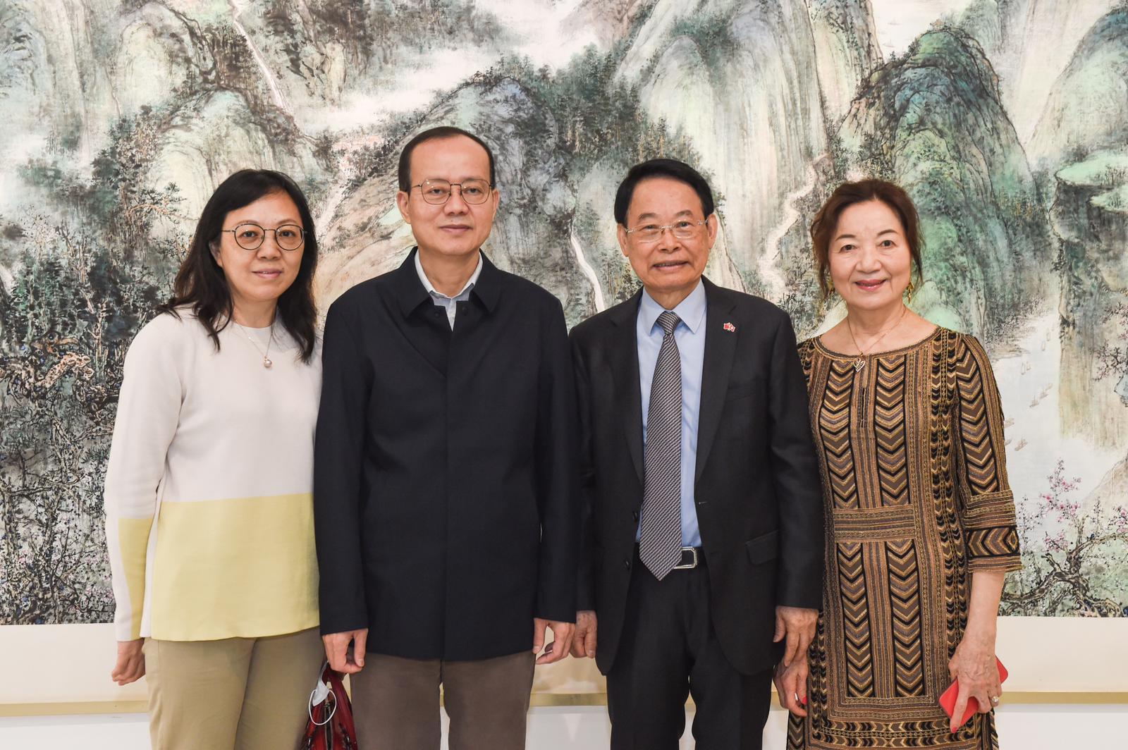 楊健伉儷(左一左二)和蕭暉榮伉儷(右一右二)在作品前合影留念。