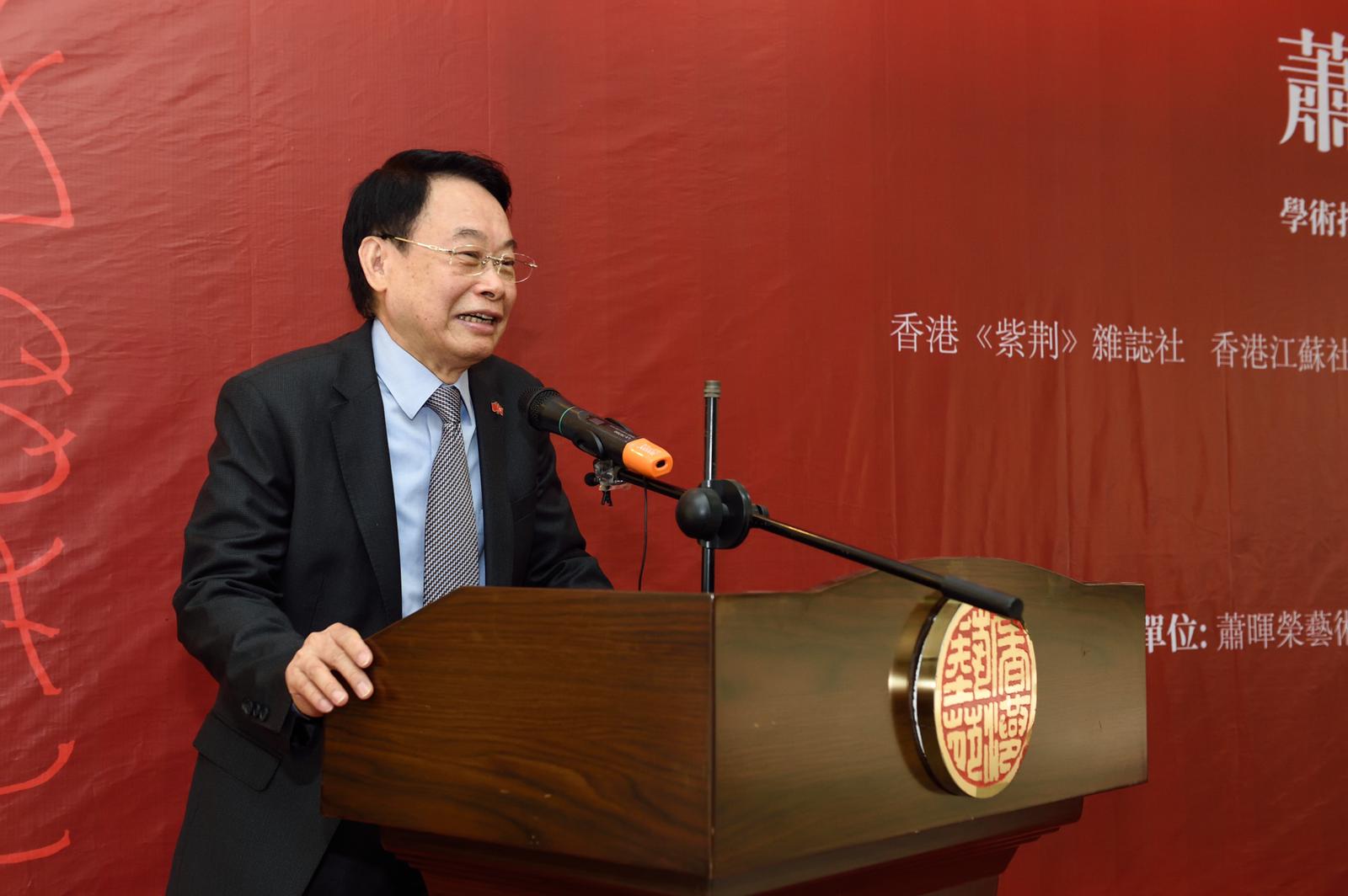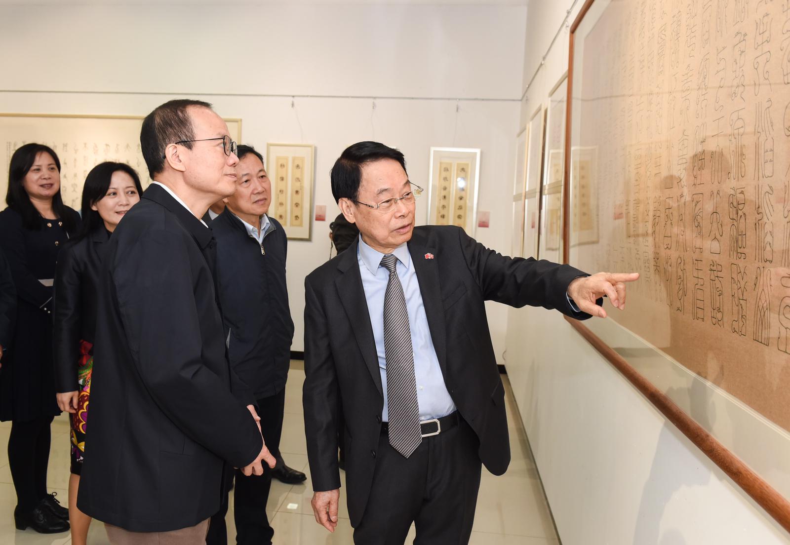 蕭暉榮(左三)陪同全國政協委員、香港中聯辦原副主任楊健(左四)等嘉賓為畫展鳴鑼揭幕 。