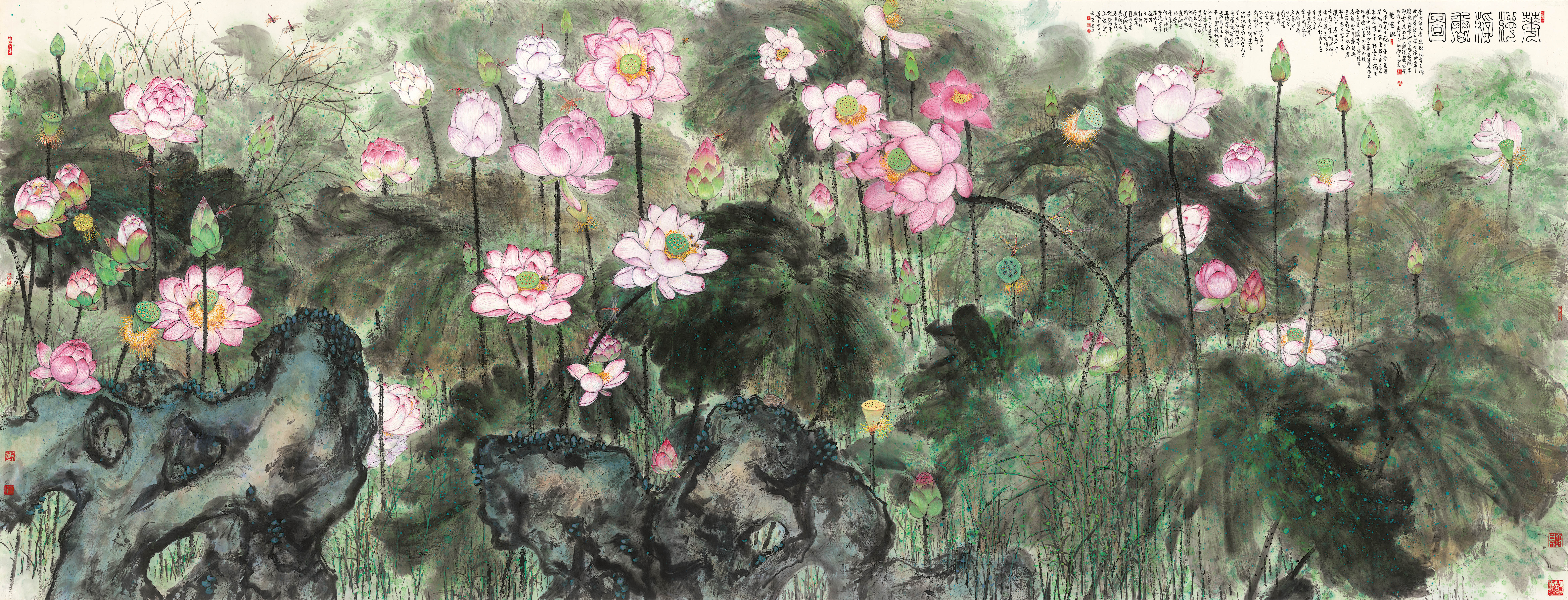 蕭暉榮作品《華池浮香圖》,191.5x501.5cm, 2020年,設色紙本。