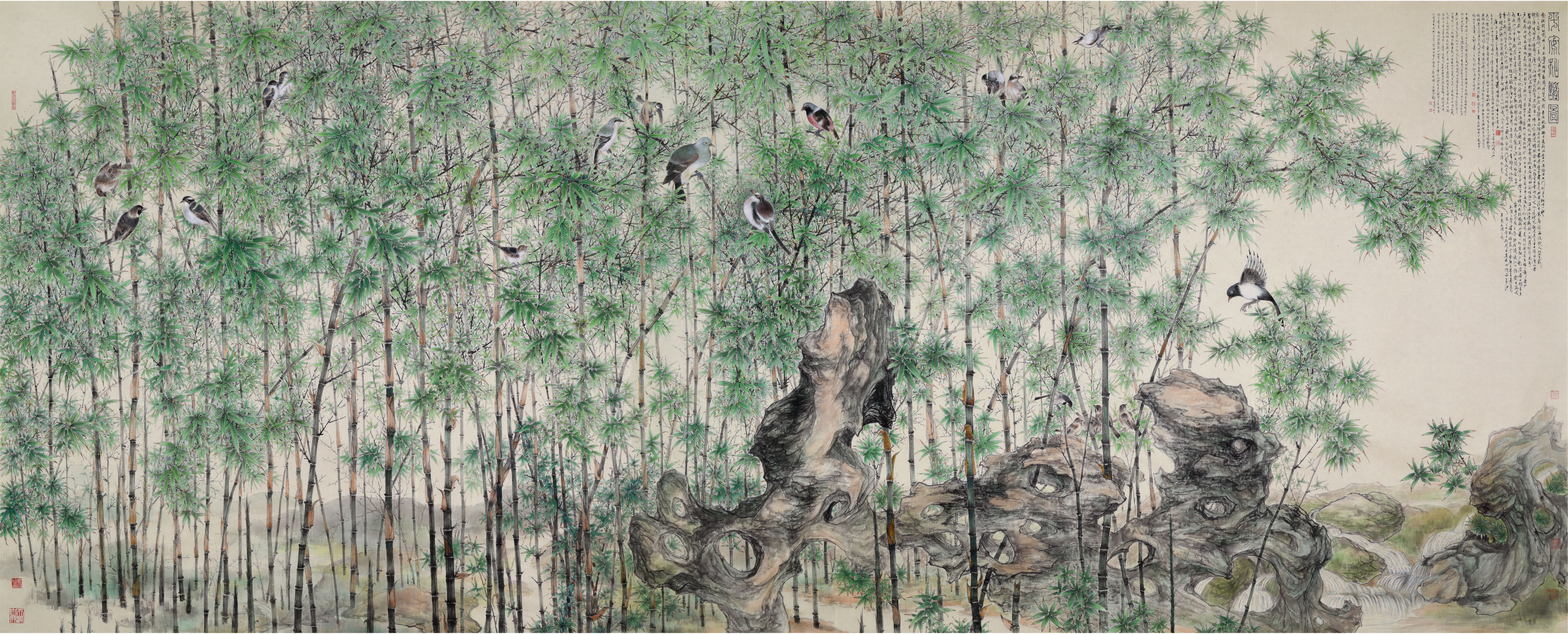 蕭暉榮作品《平安和諧圖》,192X487cm,2020年作,設色絹本。該作品從尺幅、立意、造型及構圖布局皆獨樹一幟,兼具高古的筆墨意趣與時代精神,別出心裁。