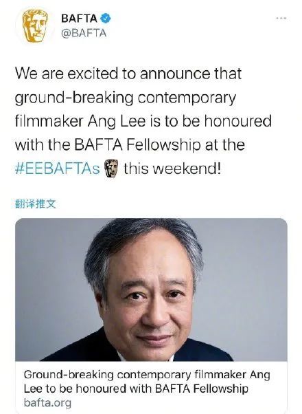 據外媒報道,著名導演李安獲頒第74屆英國電影學院獎(BAFTA)終身成就獎,他也是第一位榮獲英國電影學院獎終身成就獎的華人導演。
