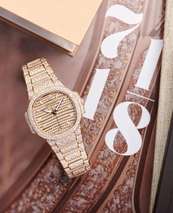 Nautilus高級珠寶腕表7118/1450R-001,以玫瑰金款式登場,全表鑲嵌鑽石潤飾,光芒耀目。