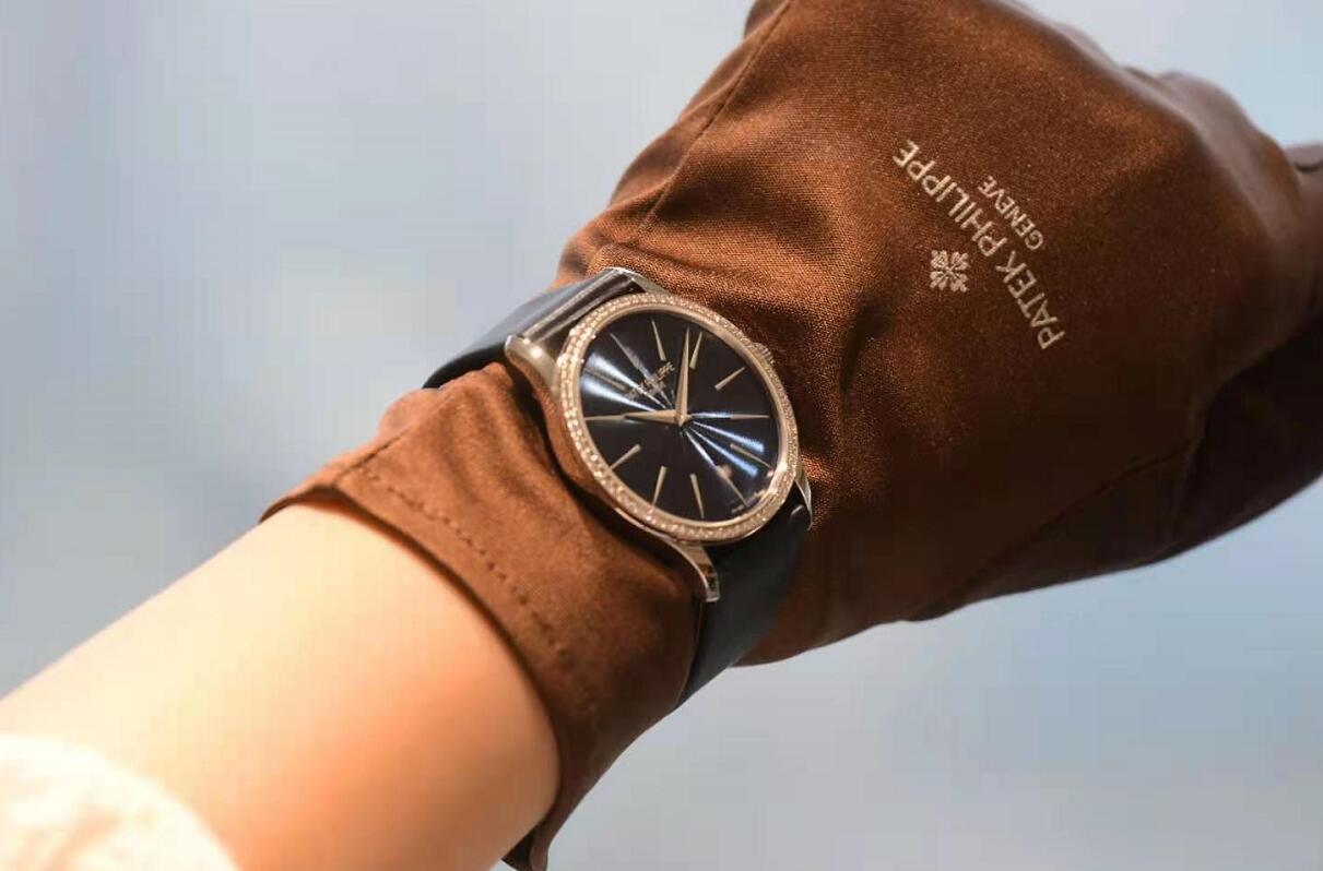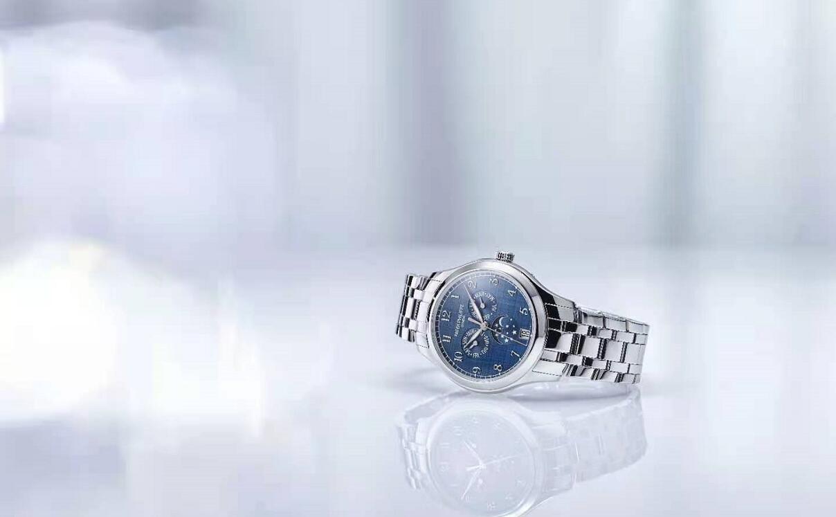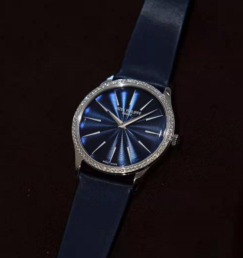 另一款奪人眼目的是Calatrava系列的4997/200G-001腕表,其簡約設計不失韻味,是恒常的百搭之選。此表為原有設計的33毫米表面增加2毫米,並以自動上弦超薄機芯,取代原來的人手上弦機芯。底板展現同心波浪紋理綴飾,並逐層添上透明深藍色涂漆,加上白金「粉末冶製」箭形小時刻度和白金切面皇室式指針在表面映襯之下,營造出景深及「漂浮」效果。表環鑲嵌76顆Wesselton圓鑽。新表配備磨砂小牛皮表帶,輕薄精巧,適合年輕女士。
