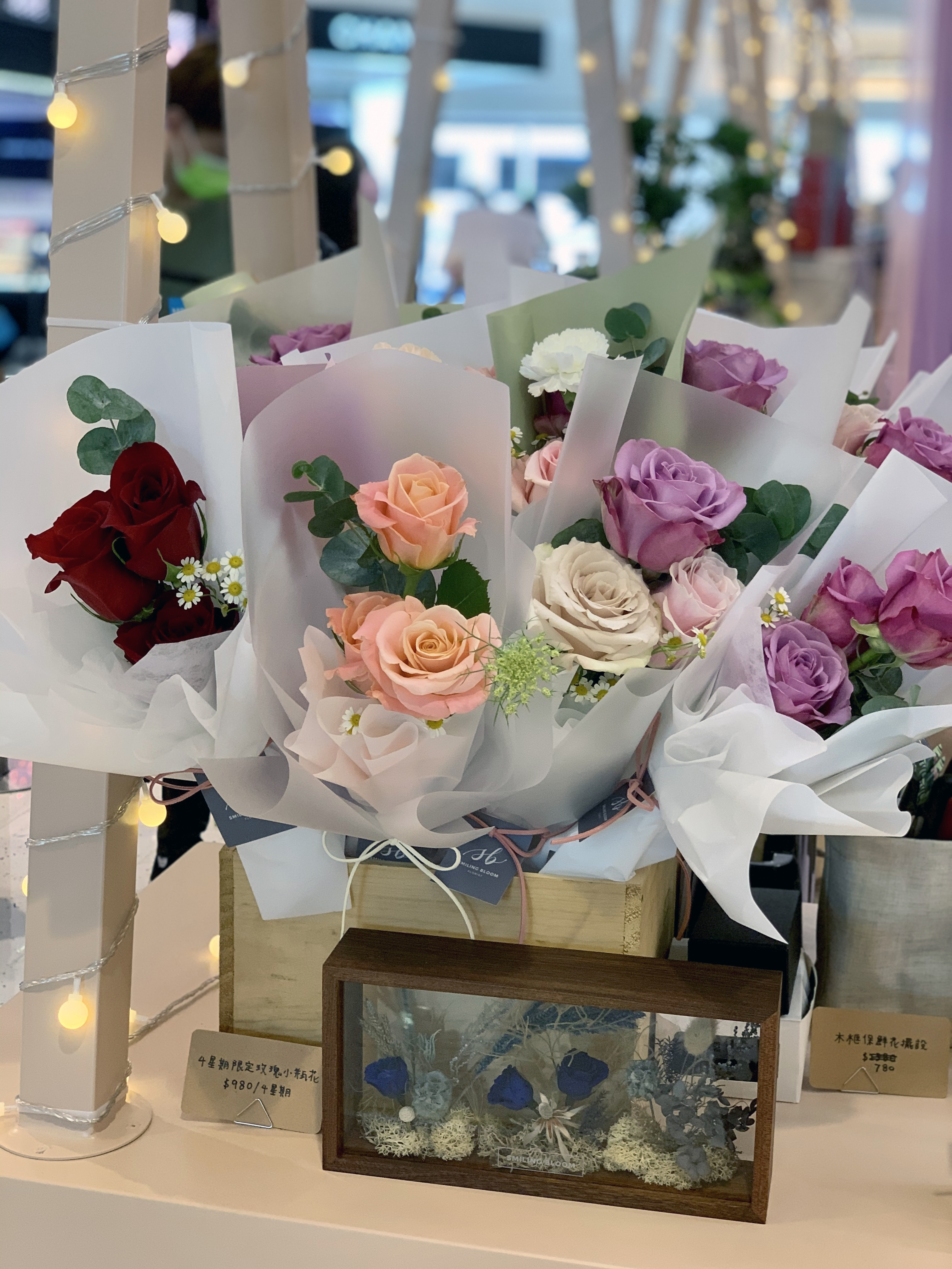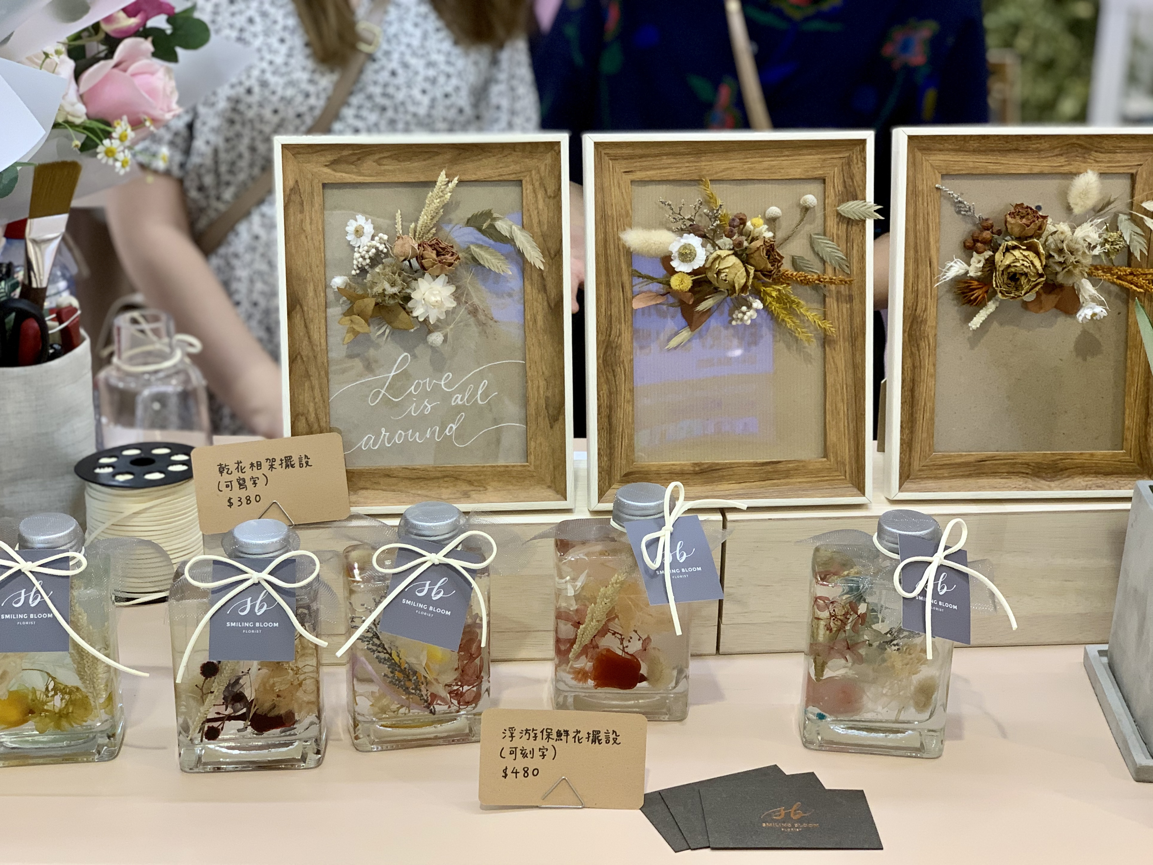 若覺得碎花口罩滿足不了你愛花的心,那麼Smiling Bloom的真花、乾花、永生花必定能為收花者的生活錦上添花。店主說該店的玫瑰皆來自肯亞或美國,花期比較長,顏色亦典雅優美,記者捧著一紮花自己送給自己,開心了一整天,這是花藝的獨有魅力。市場期間,店舖推出限定玫瑰乾花相架連英文書法。