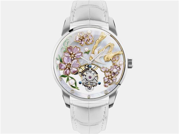 新表設計着重立體感,工匠以人手把白色的珍珠貝母雕刻成飛翔的燕子,把粉紅色貝母打造為一片片花瓣,加入美鑽為花蕊,立體感十足。表盤飾以6顆大小不一的日本Akoya天然珍珠,為配合腕表厚度及尺寸,「Yuan Jewelry」搜羅直徑只有2-4毫米、亮澤正圓的珍珠作為配飾。為了紀念是次合作,余嫿巧妙地把「Yuan Jewelry」的標誌融入到樹枝的設計中,代表三方聯乘。