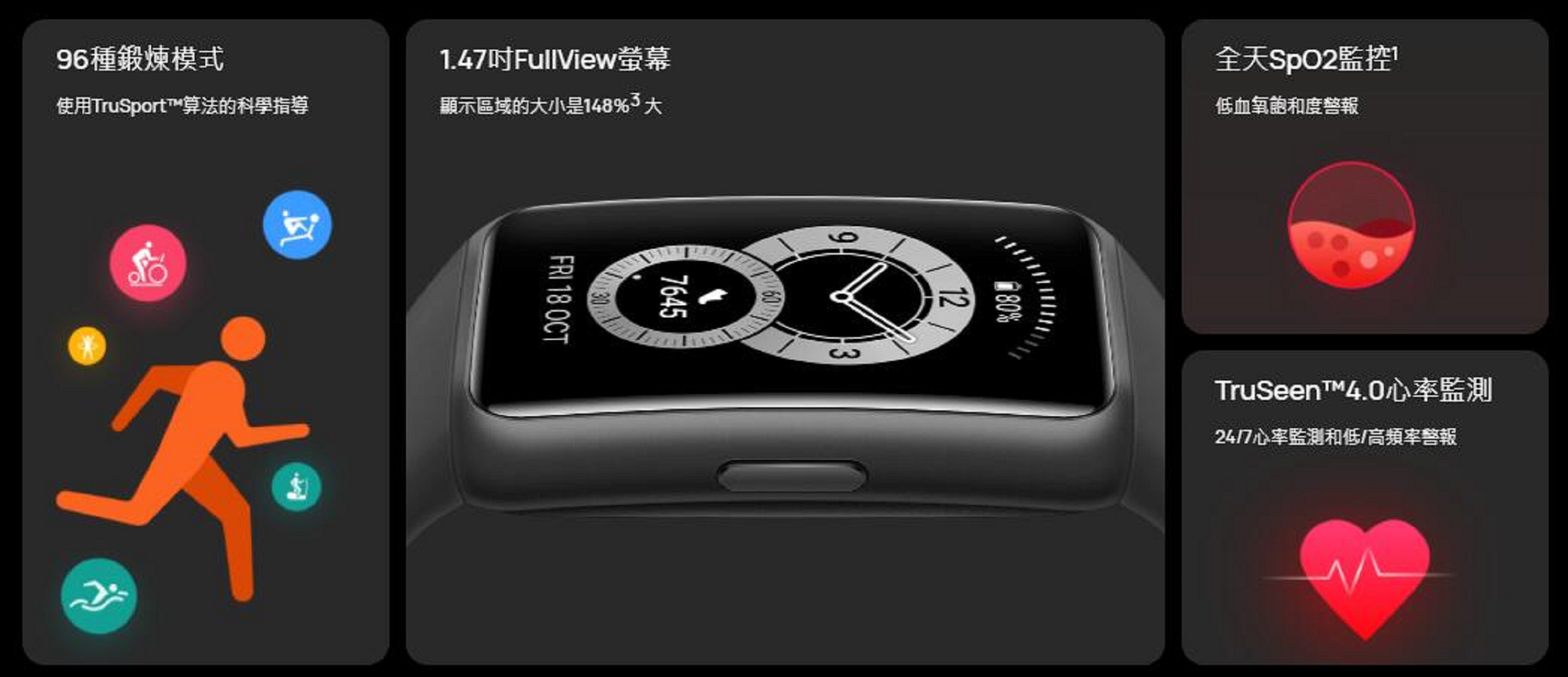 Band 6採用1.47吋矩形AMOLED大屏幕,解像度達194 x 368,使畫面資訊顯示更清晰。提供14天超長續航力,在健康監測上提供全天候連續血氧、心率、睡眠、壓力和生理周期偵測功能,當用戶心率過高或過低時,手表會及時發出提醒。提供96種運動模式,包括跑步、游泳、單車、划艇等,涵蓋市民喜歡的主流運動,智能感應器可全面偵測運動時的心率、心率區間、卡路里消耗及運動時間等資料,透過運動演算法打造更科學化的運動方式。