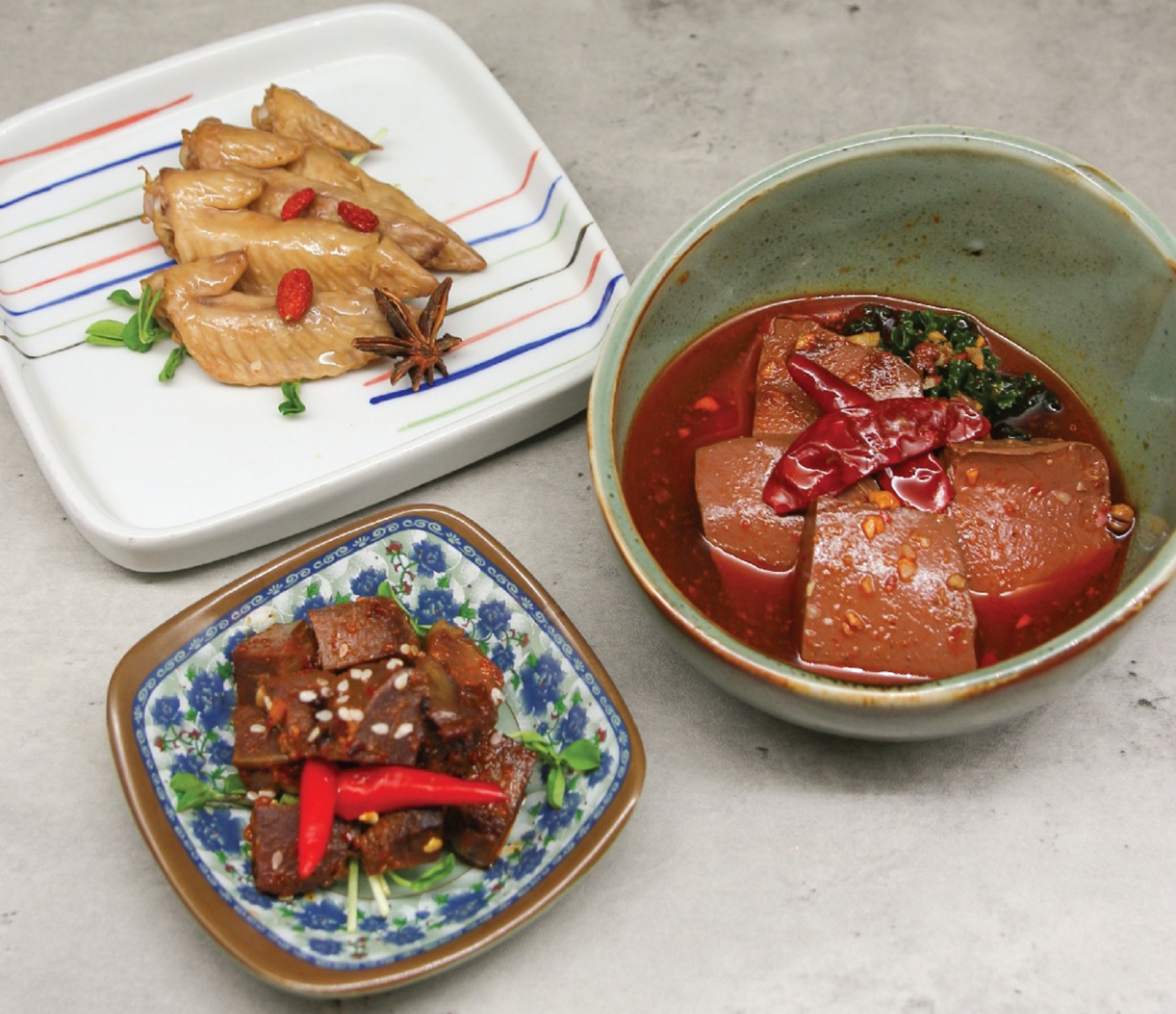 除火鍋配料外,亦可點叫台灣地道古早味小食,包括藥膳醉翅尾(左上)、老虎醬雞胗(中)及麻辣鴨血(右上)。