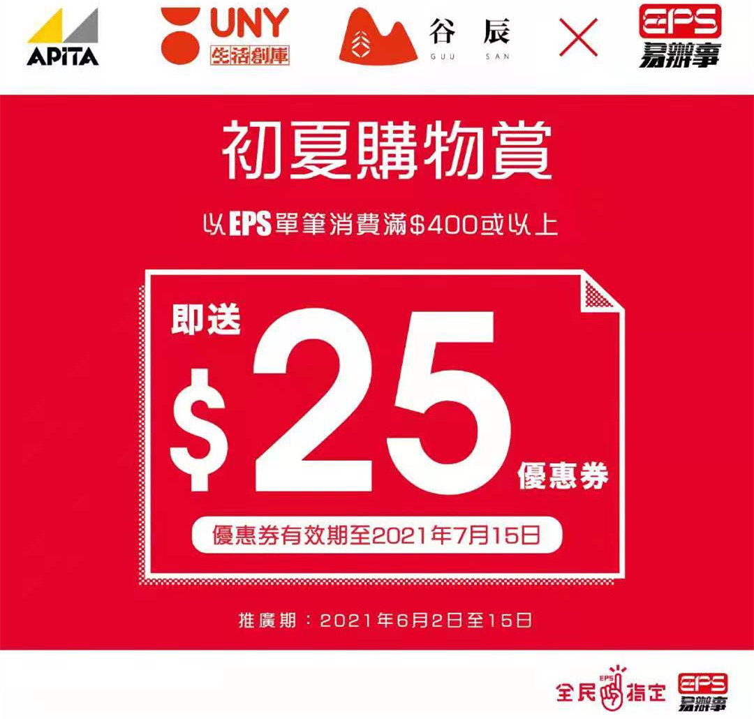 顧客可於2021年6月2日至7月15日以EPS結帳並消費滿HK$50或以上,即可使用優惠券(優惠券受條款約束)