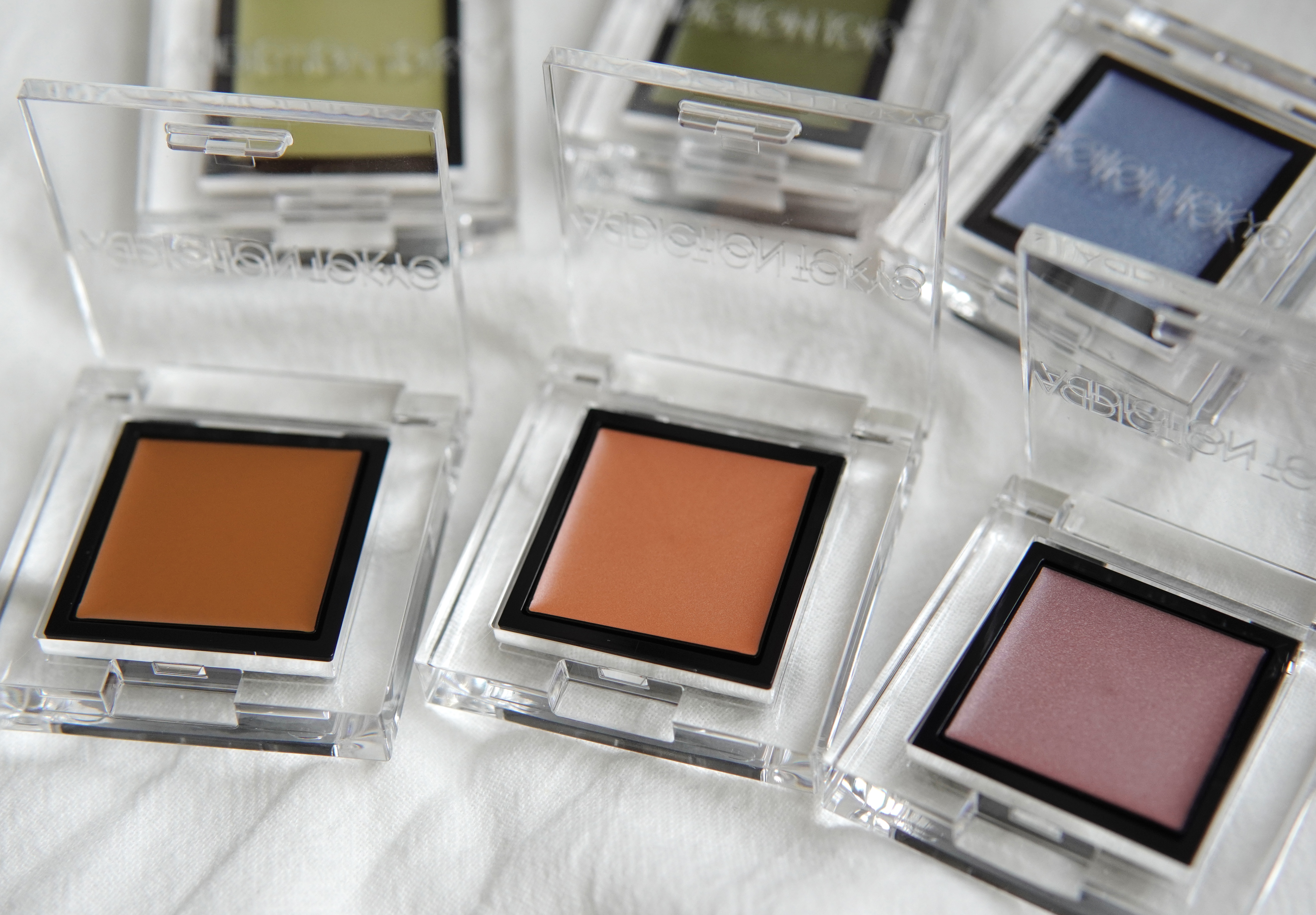 睛藝水晶原石眼影的101柔和橄欖綠色、102蜂密黃玉啡色、103瑪瑙淡珊瑚色、104紅寶石色及105藍托帕石色(從左至右)。眼影帶有微微珠光,顏色清透自然,新手也不用擔心重手。