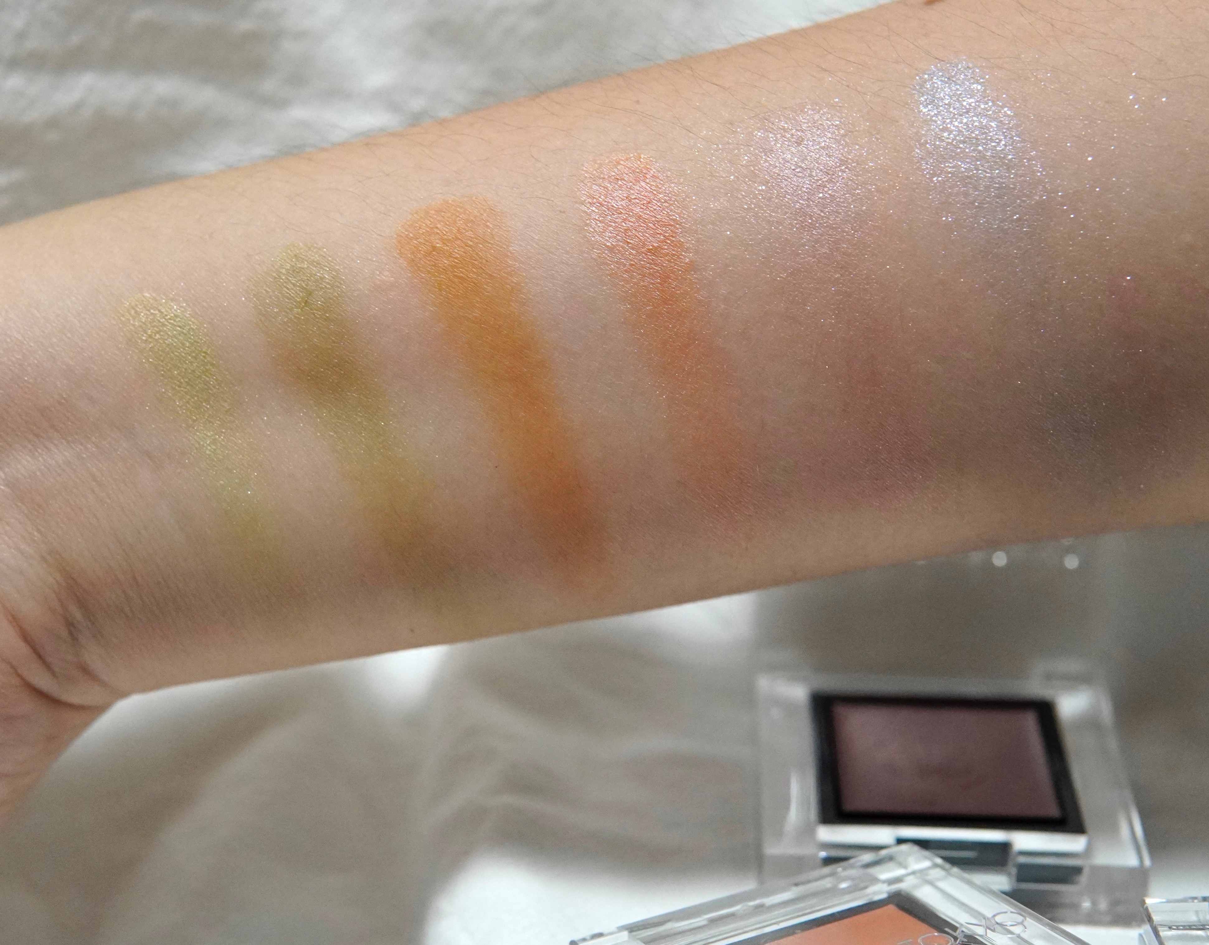 睛藝奶油眼影102C柔和橄欖綠色、103C翡翠深綠色、104C蜂密黃玉啡色、105C瑪瑙淡珊瑚色、106C紅寶石色及107C藍托帕石色(從左至右)。眼影著色細緻順滑,色彩活潑,適合夏日。