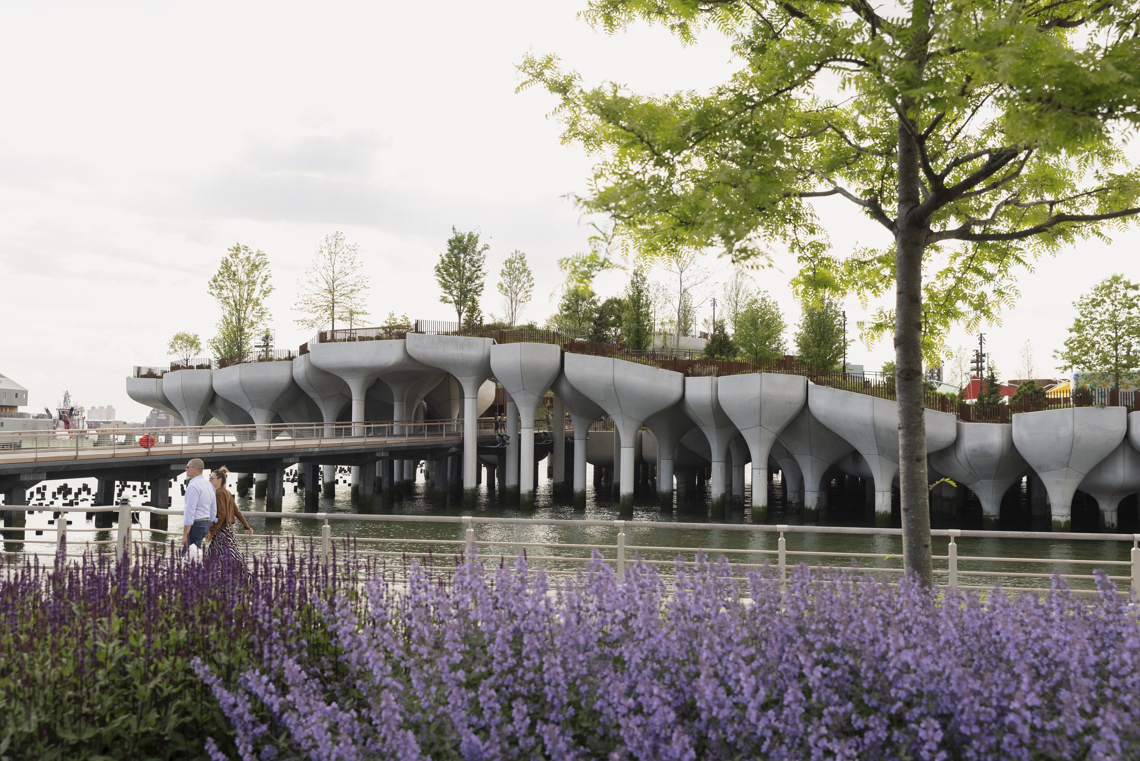 Little Island位於哈德遜河第13街,曾因過高的造價和連串的環境保護問題,而被擱置數月,最終結算的造價為2.6億美元。Little Island有132座如鬱金香花座的水泥盆柱,高低起伏、大小不一的盆柱,在水上營造出「漂浮小島」的感覺。