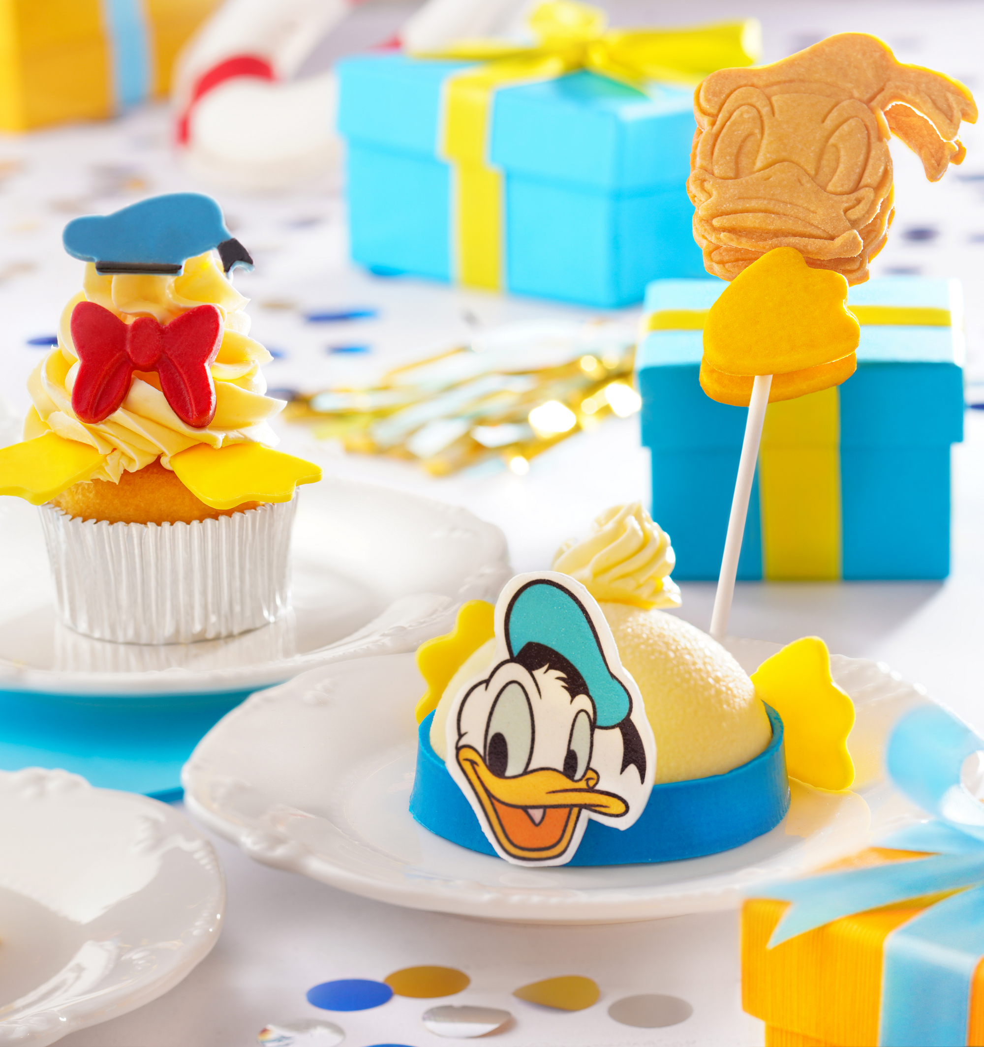 唐老鴨白朱古力藍莓忌廉檸檬蛋糕(中)、唐老鴨士多啤梨杯子蛋糕(左上)及唐老鴨紅桑子曲奇棒棒糖(右上)。