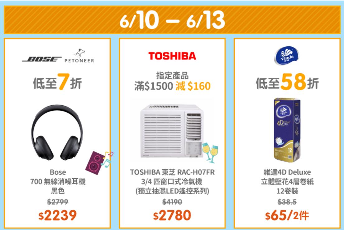父親節限定優惠:6月10日至13日至抵產品包括東芝3/4匹窗口式冷氣機,原價$4190,特價$2780