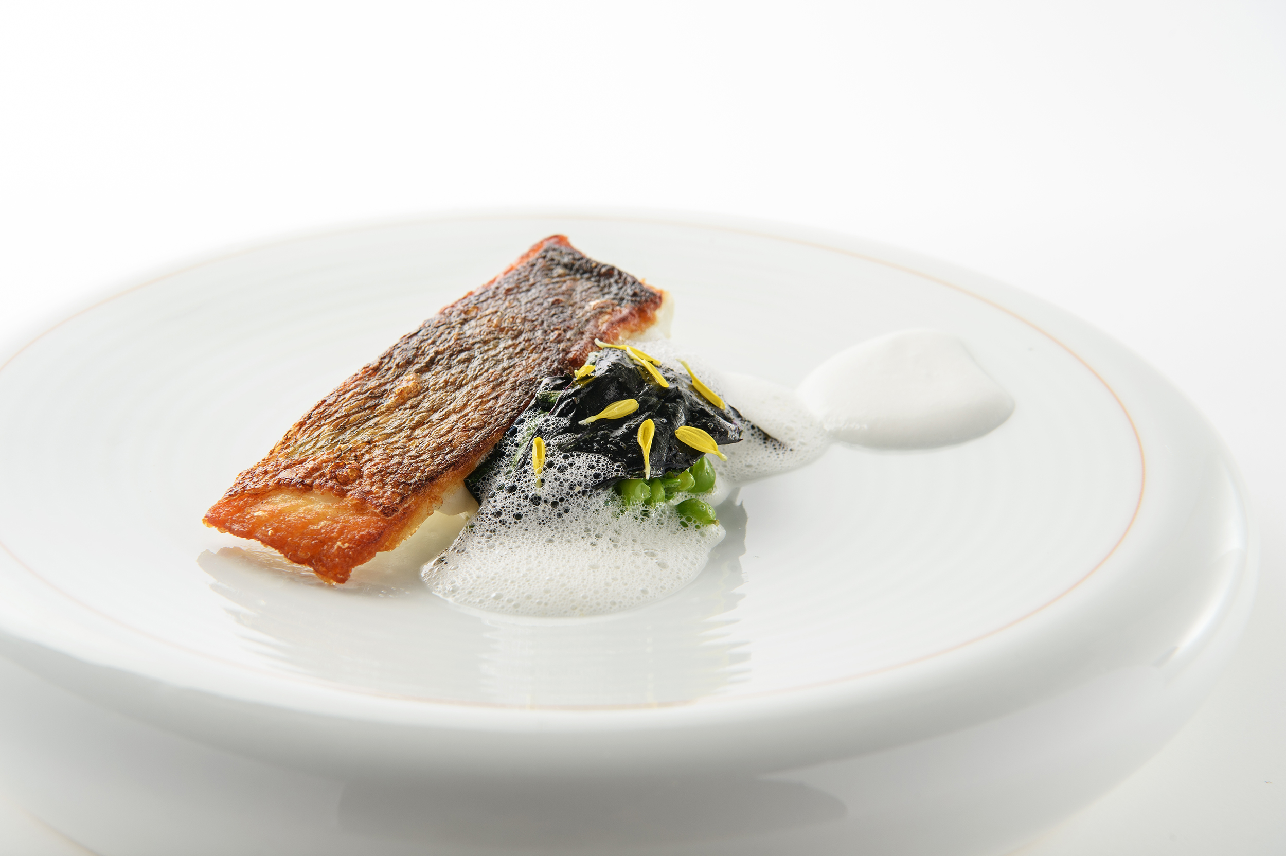 於日本交流期間,Kenny曾到訪美食之鄉——金澤市,因而認識到金時菜這種於當地極為普遍的食材,聯想到將金時菜與7月時令盛產期的鱸魚結合。在烹調手法方面,選用法國的煎煮技術,配以蕪蓉伴碟,中和口感。