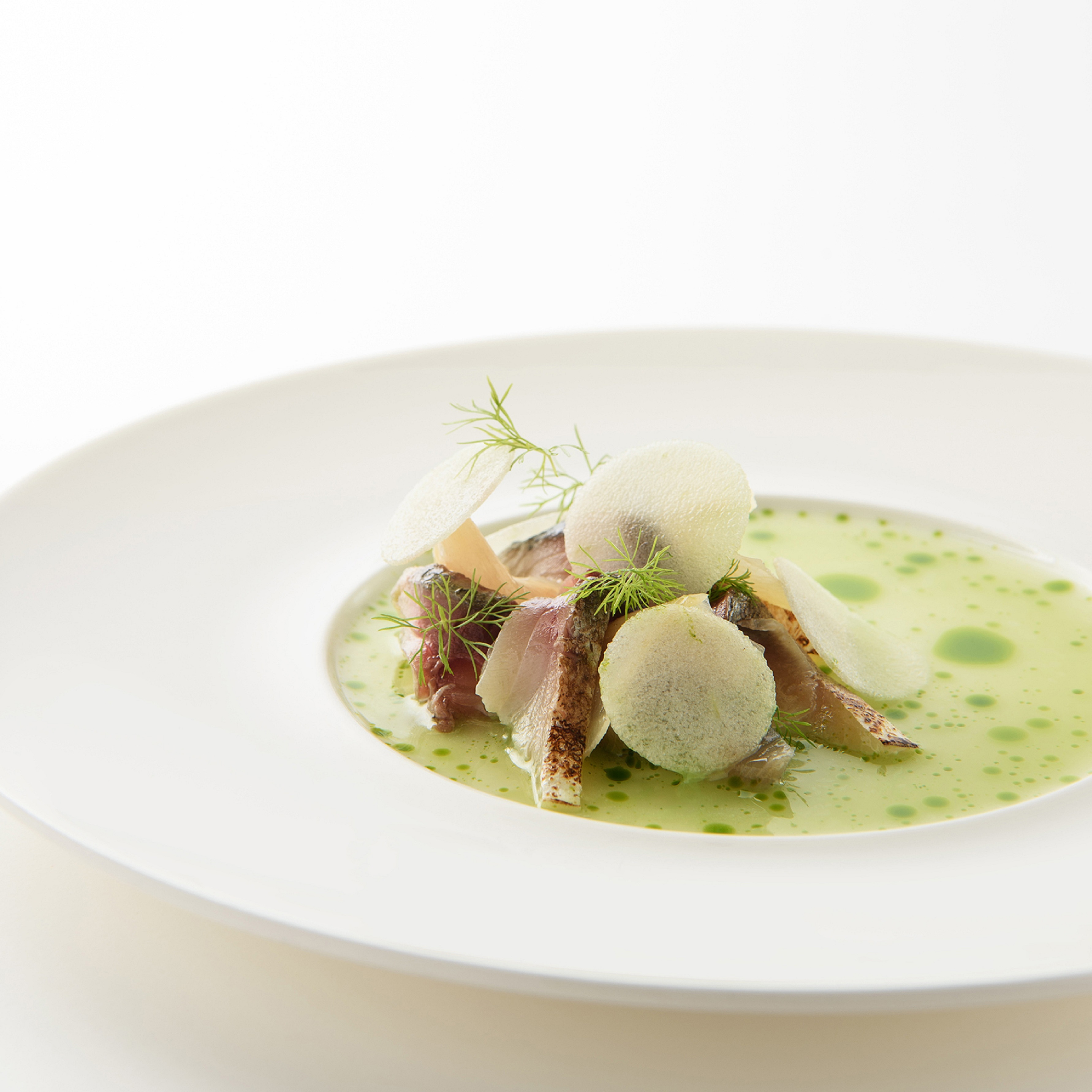 啟發自日式傳統醃鯖魚卷,Kenny選用法式料理常見的烹調及擺盤方式,他先以亞洲地區的醃製技巧處理鯖魚及子薑,並佐於由茴香結合青蘋果榨取而成的醬汁之中,綴以意大利番茜油,注入果香。