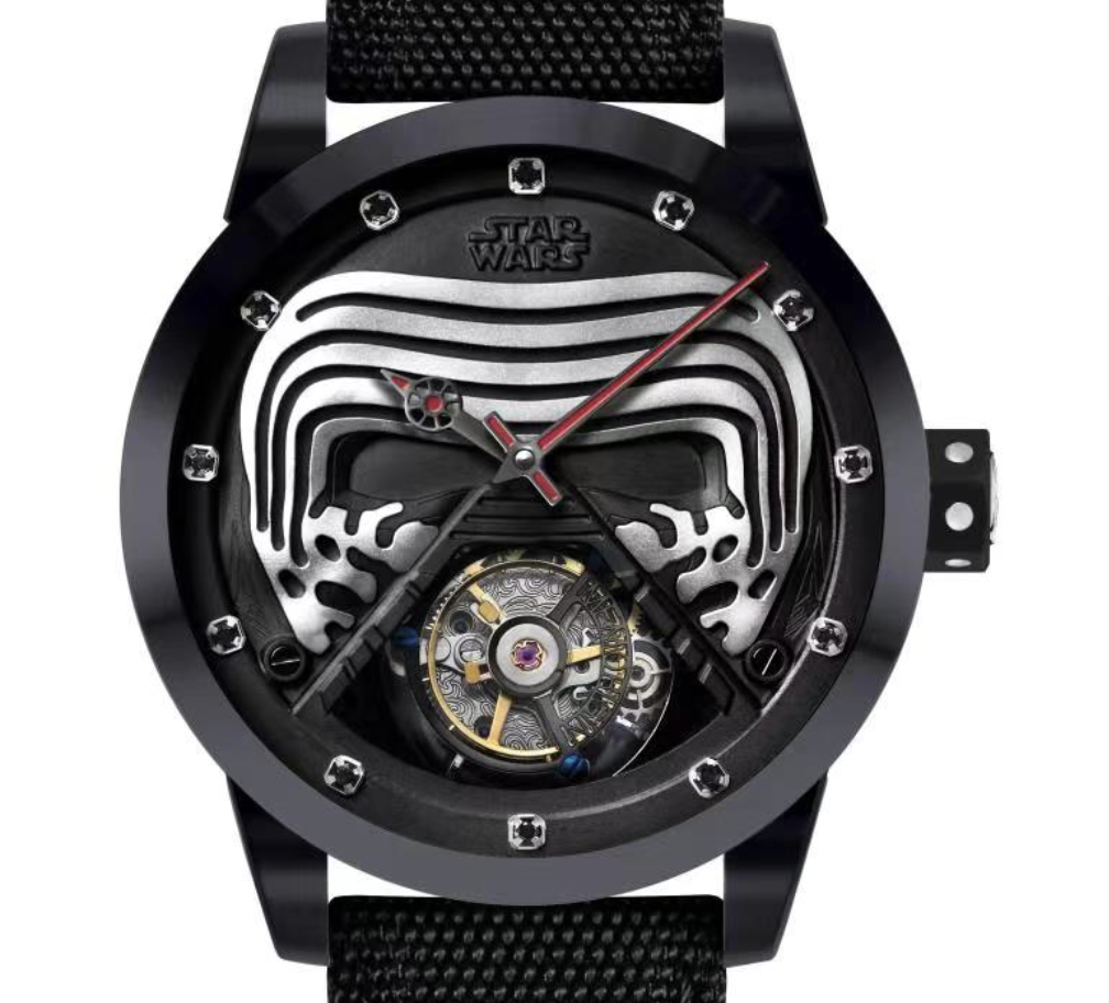 這枚《星球大戰》系列Kylo Ren陀飛輪腕表,由超級星戰粉絲、著名作曲家雷頌德設計。他表示,在故事中,Kylo Ren一直視Darth Vader(黑武士)為偶像,令Kylo Ren對力量 (The Force) 著迷,因此兩者的感覺上極為相似,但Kylo Ren性格陰沉,身穿斗篷外套的他,像隱藏著一股巨大的潛能。為了將角色活現於眼前,雷頌德特別將Kylo Ren的面具刻劃在表盤上,更為腕表訂製尼龍表帶,營造Kylo Ren斗篷外套般的質感。