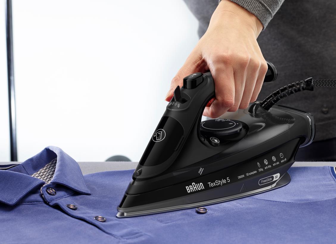 Braun TexStyle 5 蒸氣熨斗 (售價HK$768)。底板具備滑動性,加快熨衫過程,比不銹鋼底板堅硬兩倍,高效防刮。