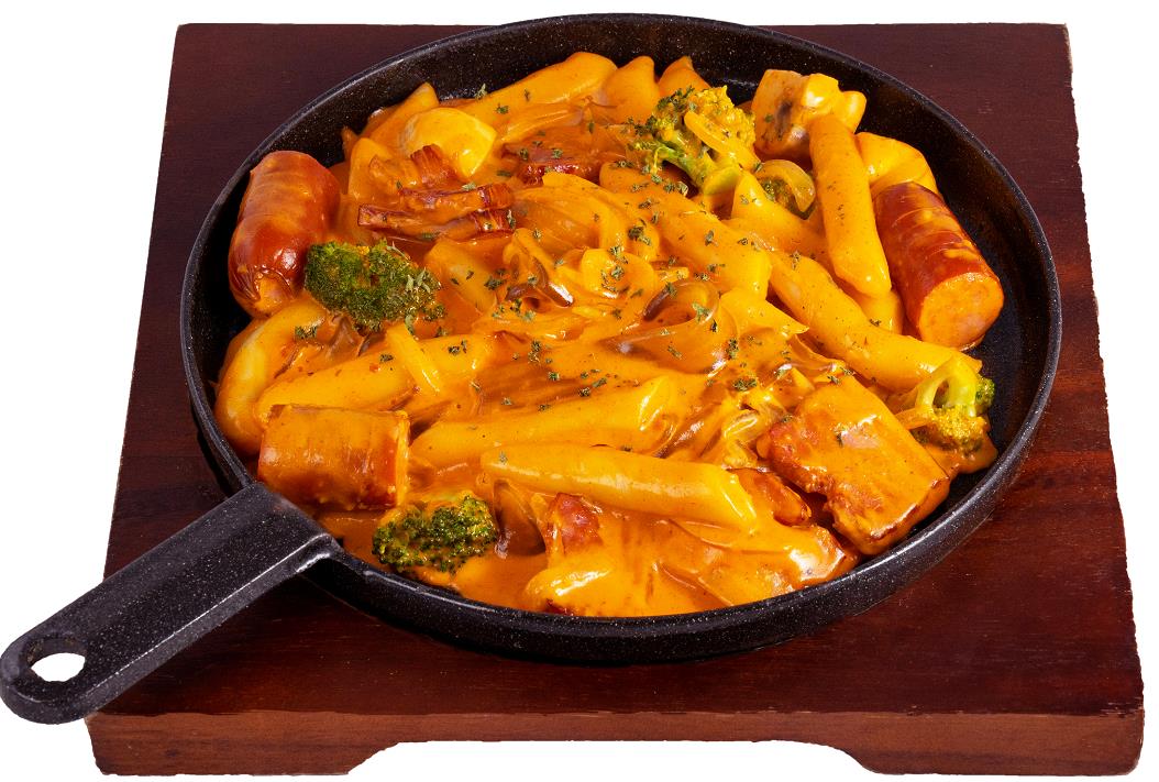 玫瑰醬寬粉炒年糕亦是韓國時下流行的菜式,玫瑰醬以辣炒年糕醬、番茄醬及忌廉調配而成,加入年糕、寬粉及香腸等配料。濃稠的玫瑰醬掛滿年糕及寬粉表面,西式醬料與韓式年糕結合,甜中帶微辣,適合怕辣又想試食韓式年糕的食客。(記者:雲遜)