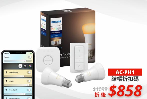 Hue藍牙黃白光智能燈膽入門套裝,原價HK$1098,優惠價HK$858。