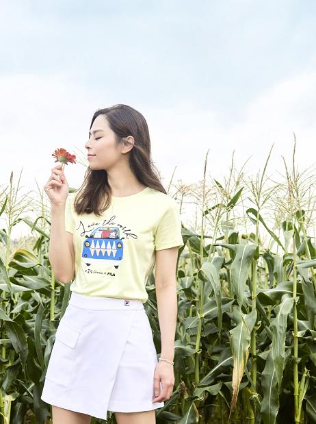 嫩黃色貓咪T恤配上白色短裙,風格休閒隨性又具少女感。