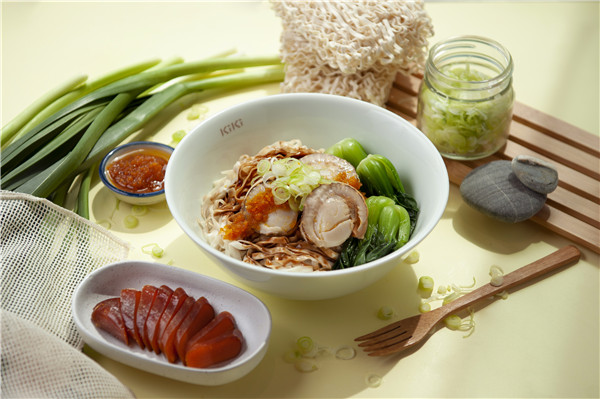 「烏魚子三星蔥油海扇蛤拌麵」,鮮甜肥美的海扇蛤注入台灣獨有的三星蔥香及烏魚子鮮味。