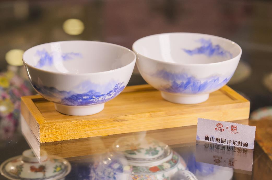供指定換領的青花瓷具,包括仙山瓊閣青花對碗(一套共兩件6吋瓷碗)(上)、繁花似錦盤碗套裝(一套兩件6吋瓷碗及兩件9吋瓷碟)(下)