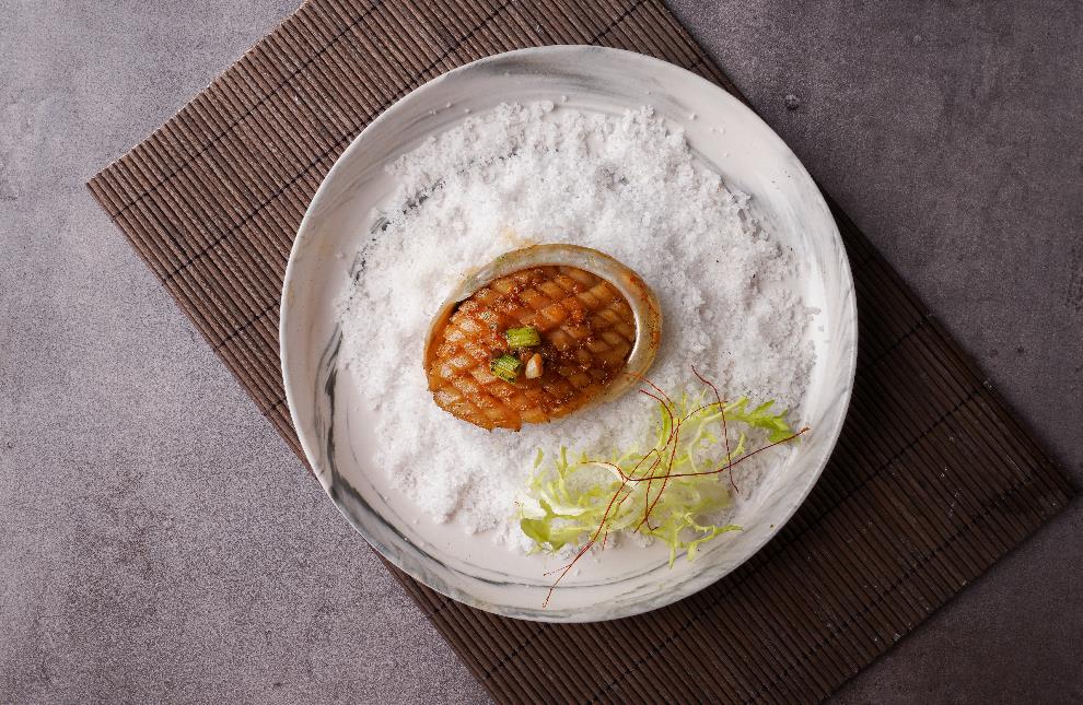 火樹銀花冶味鮮鮑魚選用南非鮑魚,用蔥花、蒜茸、燒汁將鮑魚慢火煎焗入味,上枱時會為菜式點燃,經過火焰煙燻的鮑魚表面微焦。