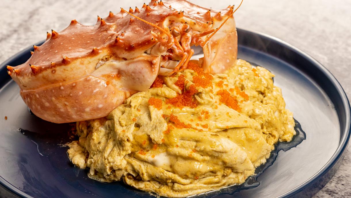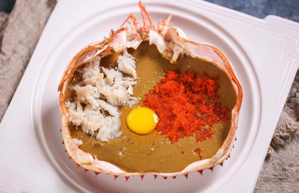 活膏甲羅燒於巨型蟹殼中放滿蟹膏、蟹肉、蟹籽及鵪鶉蛋等材料,並注入清酒燒煮。